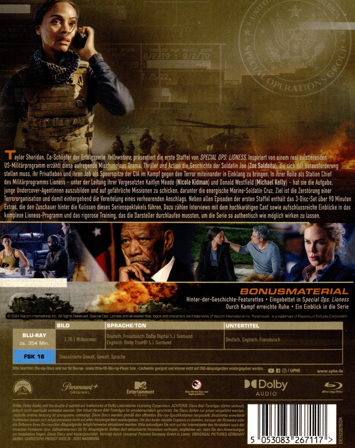 Taylor Sheridan, Co-Schöpfer der Erfolgsserie "Yellowstone", präsentiert die erste Staffel von "SSpecial Ops: Lioness". Inspiriert von einem real existierenden US-Militärprogramm erzählt diese aufregende Mischung aus Drama, Thriller und Action die Geschichte der Soldatin Joe (Zoe Saldaña), die sich der Herausforderung stellen muss, ihr Privatleben und ihren Job als Speerspitze der CIA im Kampf gegen den Terror miteinander in Einklang zu bringen. In ihrer Rolle als Station Chief des Militärprogramms Lioness - unter der Leitung ihrer Vorgesetzten Kaitlyn Meade (Nicole Kidman) und Donald Westfield (Michael Kelly) - hat sie die Aufgabe, junge Undercover-Agentinnen auszubilden und auf gefährliche Missionen zu schicken, darunter die energische Marine-Soldatin Cruz. Ziel ist die Zerstörung einer Terrororganisation und damit einhergehend die Vereitelung eines verheerenden Anschlags. Neben allen Episoden der ersten Staffel enthält das 3-Disc-Set über 90 Minuten Extras, die den Zuschauer hinter die Kulissen dieses Serienspektakels führen. Dazu zählen Interviews mit dem hochkarätigen Cast sowie aufschlussreiche Einblicke in das komplexe Lioness-Programm und das rigorose Training, das die Darsteller durchlaufen mussten, um die Serie so authentisch wie möglich wirken zu lassen.8 Episoden auf 3 DiscsDisc 1- Geopferte Kämpfer- Die harte Tour- Groß wie eine FaustDisc 2- Wir haben versagt- Die Wahrheit ist die beste Lüge- Die Lüge ist die WahrheitDisc 3- Kein Ausweg aus...