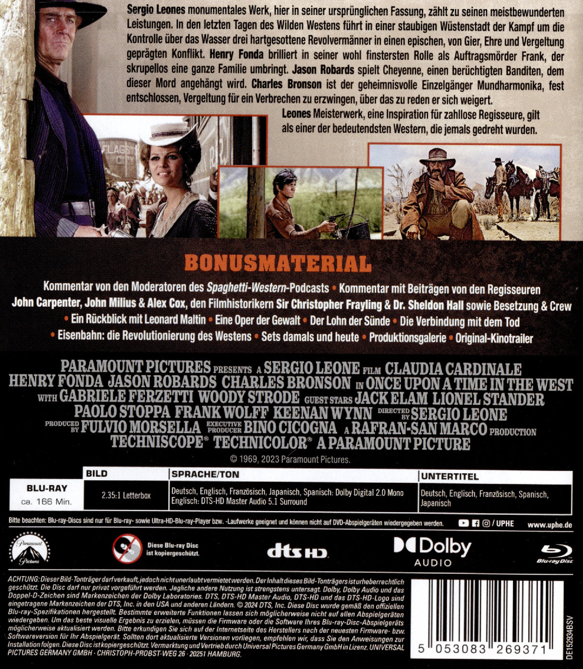 Sergio Leones monumentales Werk, hier in seiner ursprünglichen Fassung, zählt zu seinen meistbewunderten Leistungen.In den letzten Tagen des Wilden Westens führt in einer staubigen Wüstenstadt der Kampf um die Kontrolle über Wasser drei hartgesottene Revolvermänner in einen epischen Konflikt, geprägt von Gier, Ehre und Vergeltung.Henry Fonda brilliert in seiner wohl finstersten Rolle als Frank, ein Auftragsmörder, der skrupellos eine ganze Familie umbringt. Jason Robards spielt Cheyenne, einen berüchtigten Banditen, dem dieser Mord angehängt wird. Charles Bronson ist der geheimnisvolle Einzelgänger Harmonica, fest entschlossen, Vergeltung für ein Verbrechen zu erzwingen, über das er sich weigert zu reden.Leones Meisterwerk, eine Inspiration für zahllose Regisseure, gilt als einer der bedeutendsten Western, die jemals gedreht wurden.