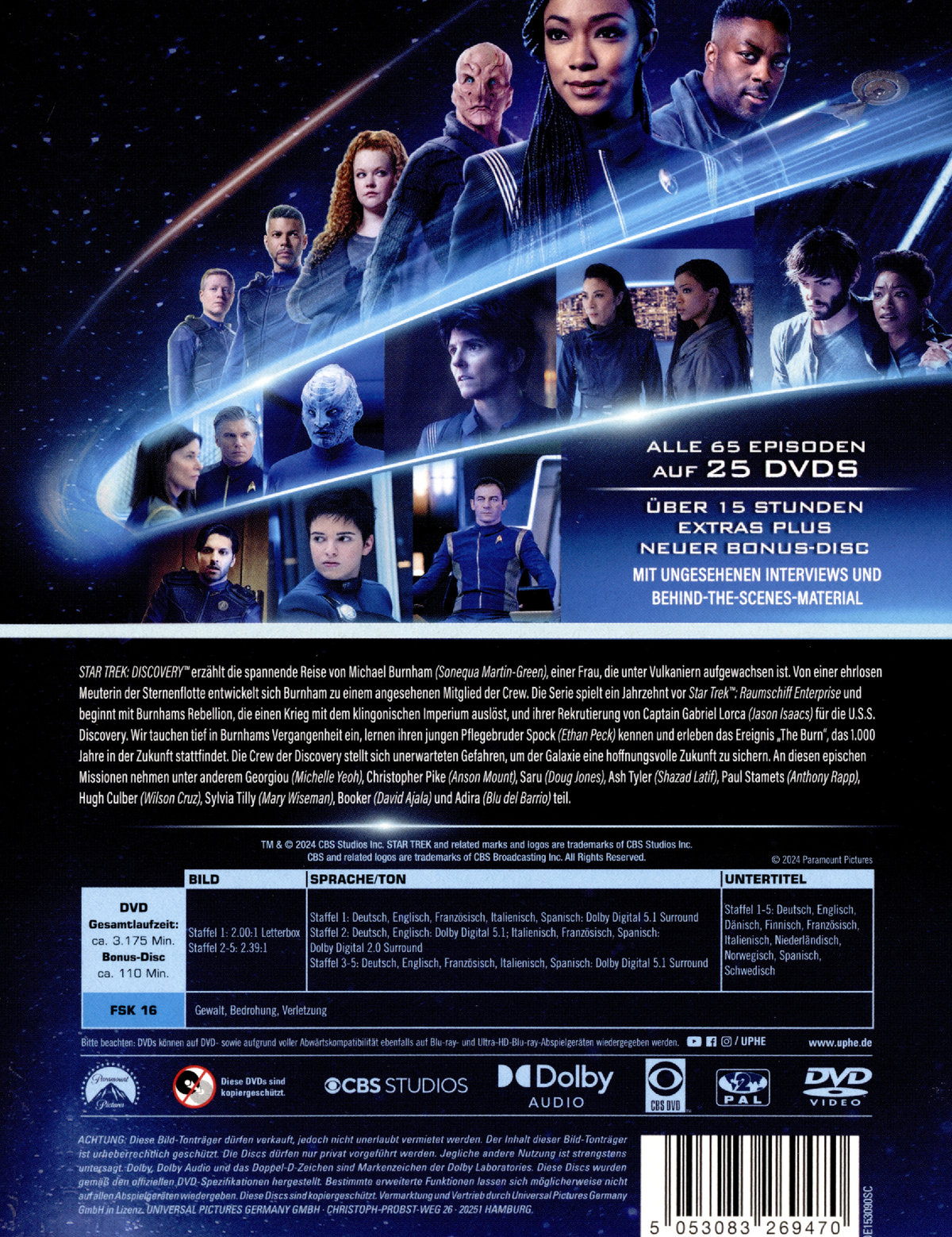 "STAR TREK: DISCOVERY™" erzählt die spannende Reise von Michael Burnham (Sonequa Martin-Green), einer Frau, die unter Vulkaniern aufgewachsen ist. Von einer ehrlosen Meuterin der Sternenflotte entwickelt sich Burnham zu einem angesehenen Mitglied der Crew. Die Serie spielt ein Jahrzehnt vor "STAR TREK™: DIE ORIGINAL SERIE" und beginnt mit Burnhams Rebellion, die einen Krieg mit dem klingonischen Imperium auslöst und ihrer Rekrutierung von Captain Gabriel Lorca (Jason Isaacs) für die U.S.S. Discovery.Wir tauchen tief in Burnhams Vergangenheit ein, lernen ihren jungen Pflegebruder Spock (Ethan Peck) kennen und erleben das Ereignis "The Burn", das 1.000 Jahre in der Zukunft stattfindet. Die Crew der Discovery stellt sich unerwarteten Gefahren, um der Galaxie eine hoffnungsvolle Zukunft zu sichern. An diesen epischen Missionen nehmen unter anderem Georgiou (Michelle Yeoh), Christopher Pike (Anson Mount), Saru (Doug Jones), Ash Tyler (Shazad Latif), Paul Stamets (Anthony Rapp), Hugh Culber (Wilson Cruz), Sylvia Tilly (Mary Wiseman), Booker (David Ajala) und Adira (Blu del Barrio) teil.Dieses Set enthält alle 65 Episoden auf 25 DVDs + Bonus-Disc oder 20 Blu-rays + Bonus-Disc