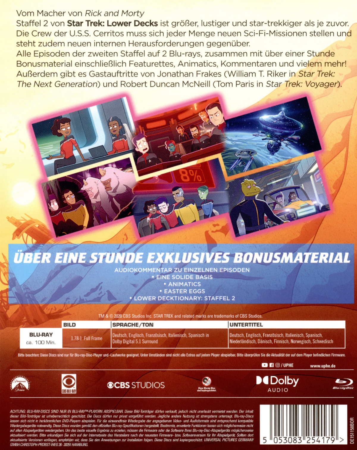 Vom Macher von Rick and MortyStaffel 2 von "Star Trek: Lower Decks" ist größer, lustiger und Star Trekkiger als je zuvor.Die Crew der U.S.S. Cerritos muss sich jeder Menge neuen Sci-Fi-Missionen stellen und steht zudem noch neuen internen Herausforderungen gegenüber.Alle Episoden der zweiten Staffel auf 2 Blu-rays, zusammen mit über einer Stunde Special Features, einschließlich Featurettes, Animatics, Kommentaren und vielem mehr! Außerdem gibt es Gastauftritte von Jonathan Frakes (William T. Riker in "Star Trek: The Next Generation") und Robert Duncan McNeill (Tom Paris in "Star Trek: Voyager").EpisodenübersichtDisc 1:- Seltsame Energien- Kayshon, seine Augen offen- Begegnung mit der Befangenheit- Mugato, Gumato- Die Doopler-VerwirrungDisc 2:- Der große, braune Spion- Wo die lust‘gen Quellen liegen- Ich, Excretus- wej Duj- Erster Kontakt
