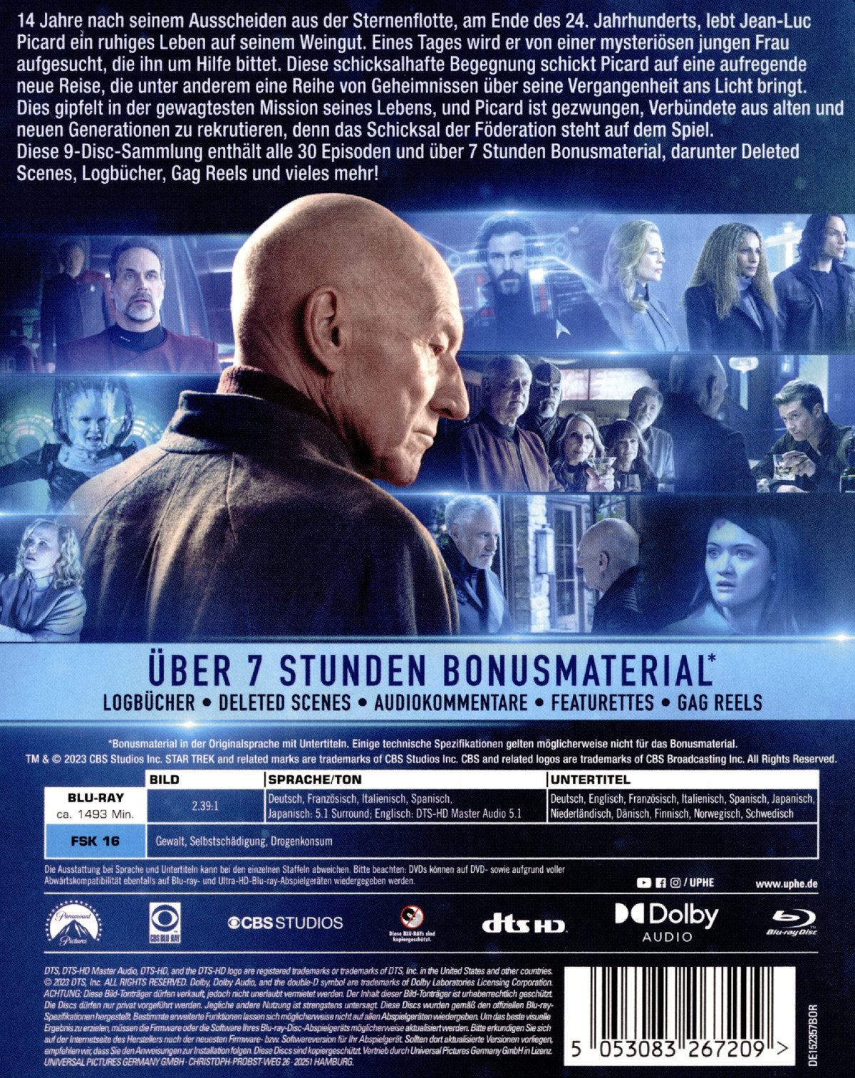 14 Jahre nach seinem Ausscheiden aus der Sternenflotte, am Ende des 24. Jahrhunderts, lebt Jean-Luc Picard ein ruhiges Leben auf seinem Weingut. Eines Tages wird er von einer mysteriösen jungen Frau aufgesucht, die ihn um Hilfe bittet. Diese schicksalhafte Begegnung schickt Picard auf eine aufregende neue Reise, die unter anderem eine Reihe von Geheimnissen über seine Vergangenheit ans Licht bringt. Dies gipfelt in der gewagtesten Mission seines Lebens und Picard ist gezwungen, Verbündete aus alten und neuen Generationen zu rekrutieren, denn das Schicksal der Föderation steht auf dem Spiel. Diese 9-Disc-Sammlung enthält alle 30 Episoden und über 7 Stunden Special Features, darunter Deleted Scenes, Story Logs, Gag Reels und vieles mehr!
