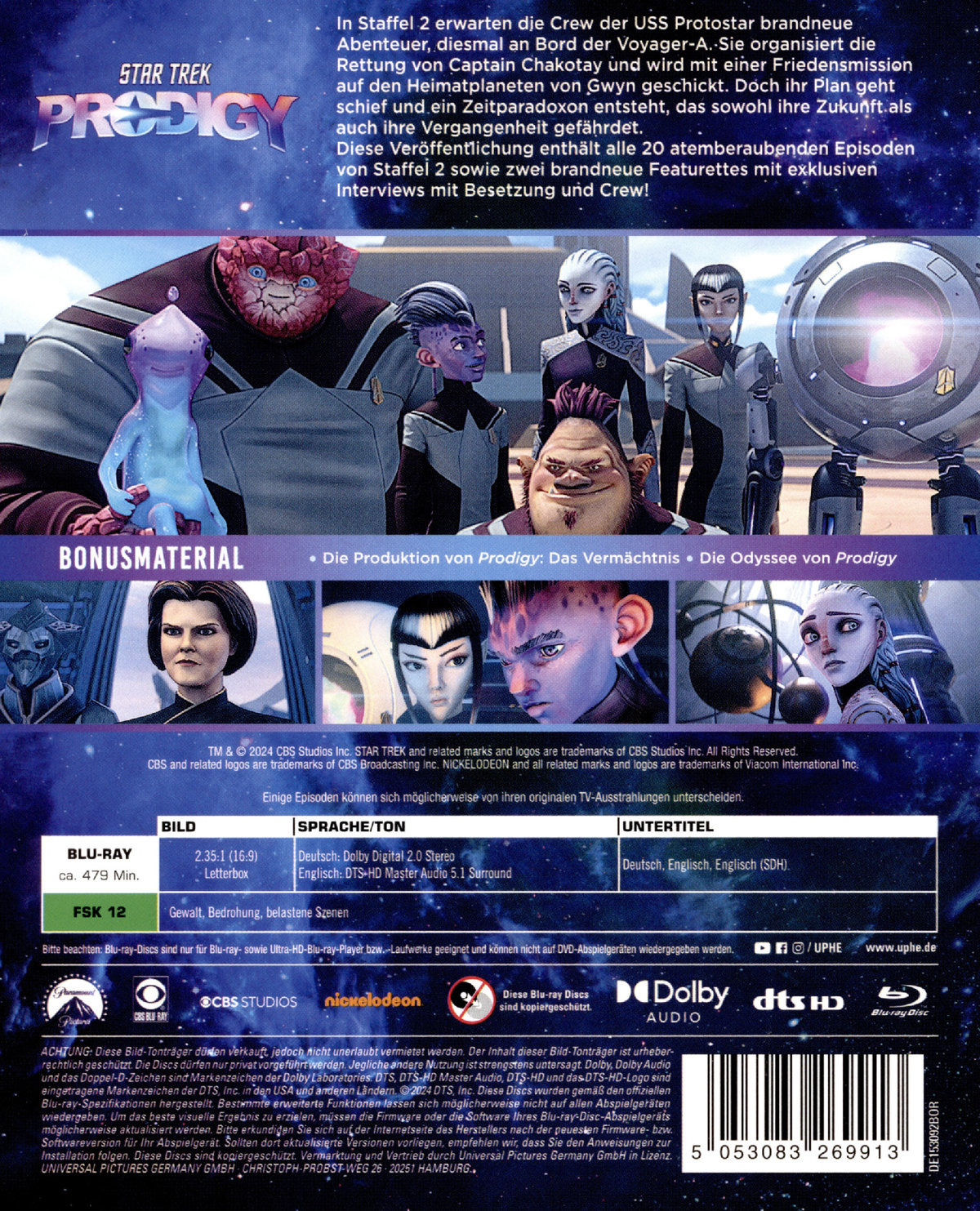 In Staffel 2 erwarten die Crew der USS Protostar brandneue Abenteuer, diesmal an Bord der Voyager-A. Sie organisiert die Rettung von Captain Chakotay und wird mit einer Friedensmission auf den Heimatplaneten von Gwyn geschickt. Doch ihr Plan geht schief und ein Zeitparadoxon entsteht, das sowohl ihre Zukunft als auch ihre Vergangenheit gefährdet.Diese Veröffentlichung enthält alle 20 atemberaubenden Episoden von Staffel 2 sowie zwei brandneue Featurettes mit exklusiven Interviews mit Besetzung und Crew!Alle Episoden der zweiten Staffel auf 3 DiscsEpisodenübersichtDisc 1- Gegen die Regeln, Teil I & II- Wer rettet die Retter?- Grundlagen der temporalen Mechanik- Das Beobachter-Paradoxon- Hochstapler-Syndrom- Das WettrennenDisc 2- Im Rausch der Sinne- Wettlauf gegen die Zeit, Teil I & II- Letzter Flug der Protostar, Teil I & II- Planet der Tribbles- Im SpiegeluniversumDisc 3- Asencias Aufstieg, Teil I & II- Am Rande des Abgrunds- Kein Silberstreif am Horizont- Der Anfang vom Ende, Teil I & II