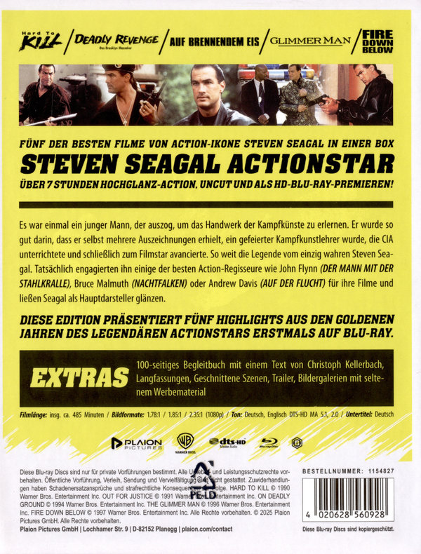 Es war einmal ein junger Mann, der auszog, um das Handwerk der Kampfkünste zu erlernen. Er wurde so gut darin, dass er selbst mehrere Auszeichnungen erhielt, ein gefeierter Kampfkunstlehrer wurde, die CIA unterrichtete und schließlich ein Filmstar wurde. So weit die Legende vom einzig wahren Steven Seagal. Tatsächlich engagierten ihn einige der besten Action-Regisseure wie John Flynn (DER MANN MIT DER STAHLKRALLE), Bruce Malmuth (NACHTFALKEN) oder Andrew Davis (AUF DER FLUCHT) für ihre Filme und ließen Seagal als Hauptdarsteller glänzen. Diese Edition präsentiert fünf Highlights aus den goldenen Jahren des legendären Actionstars erstmals auf Blu-ray. Hard to Kill: ca. 96 Minuten Out for Justice: ca. 91 Minuten On Deadly Ground: ca. 102 Minuten The Glimmer Man: ca. 91 Minuten Fire Down Below: ca. 105 Minuten