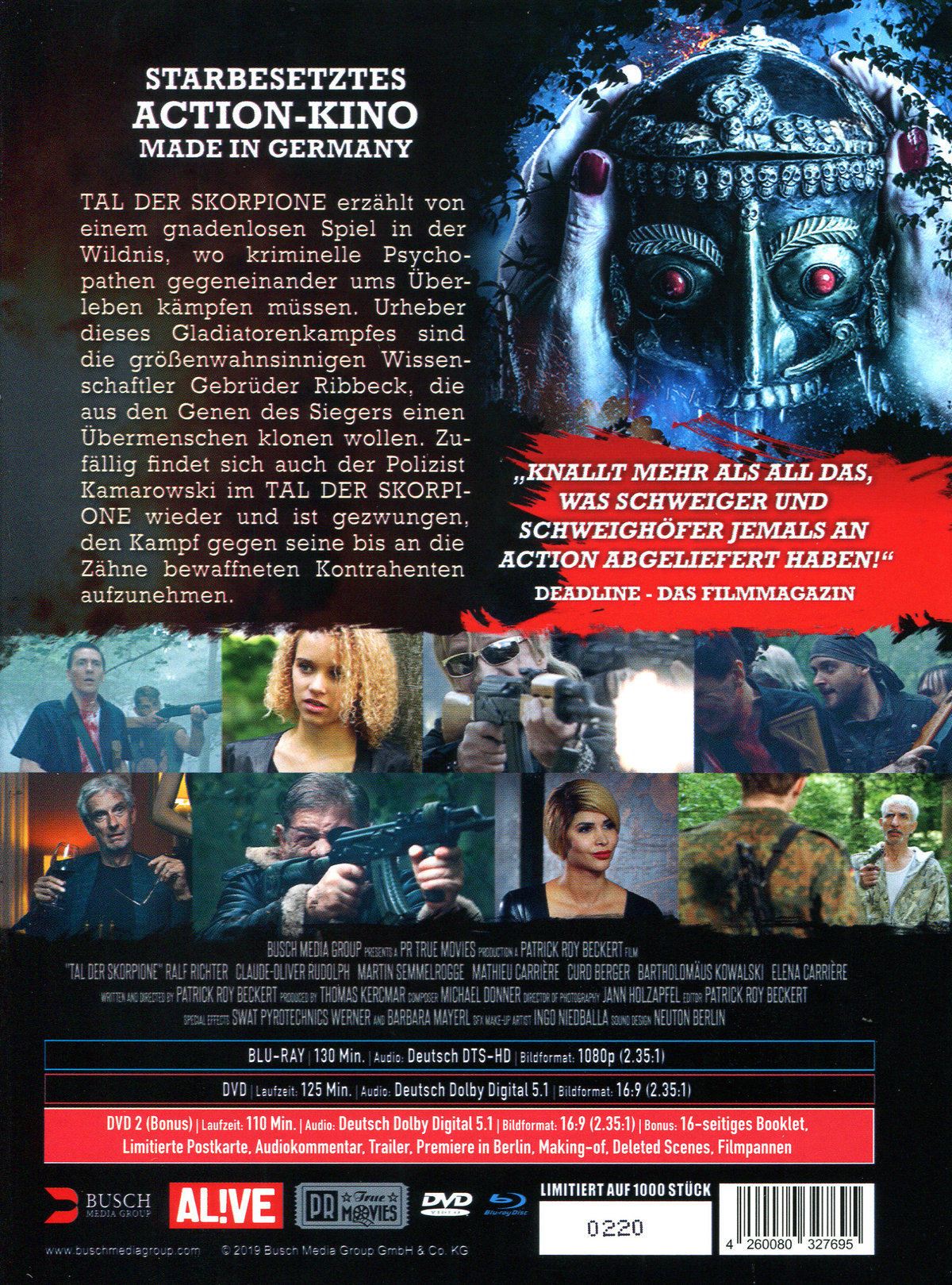 Tal der Skorpione erzählt von einem Gnadenlosen Spiel in der Wildnis, wo kriminelle Psychopathen gegeneinander ums Überleben kämpfen müssen. Urheber dieses Gladiatorenkampfes sind die größenwahnsinnigen Wissenschaftler Gebrüder Ribbeck, die aus den Genen des Siegers einen Übermenschen klonen wollen. Mittendrin findet sich der Polizist Kamarowski wieder - und steht nun bis an die Zähne bewaffneten Schwerverbrechern gegenüber. Haupt- und Nebenrollen sind mit prominenten Genre-Altstars besetzt: Nach 38 Jahren ist die Mannschaft aus Wolfgang Petersens Klassiker "Das Boot" wieder versammelt (Ralf Richter, Martin Semmelrogge, Claude-Oliver Rudolph). Darüber hinaus wurde die Rolle des Oberschurken mit Mathieu Carrière besetzt. Zudem sind viele weitere aus den Medien bekannte Namen vertreten, darunter u.a. Germany’s Next Topmodel-Finalistin Elena Carrière, Bert Wollersheim oder Micaela Schäfer. "Knallt mehr als all das, was Schweiger und Schweighöfer jemals an Action abgeliefert haben!" (deadline - das Filmmagazin) Als Limited-Edition-Mediabook mit 16-seitigem Booklet und exklusivem Interview mit Regisseur Patrick Roy Beckert. Ca. 90 Minuten exklusives Bonusmaterial auf zusätzlicher DVD: u. a. mit Deleted Scenes und Behind-the-Scenes. Weiterer Bonus: Limitierte Postkarte mit illustriertem Postermotiv.