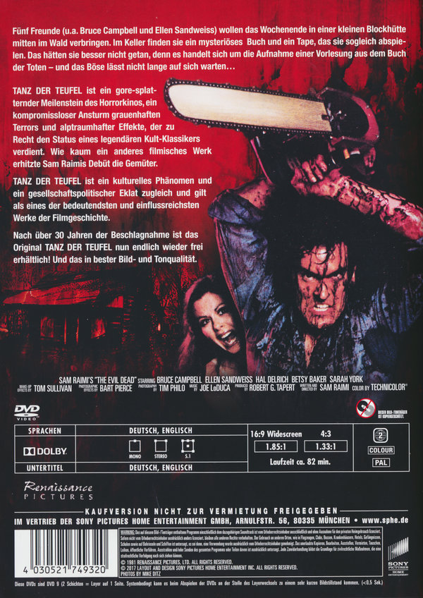Fünf Freunde (u.a. Bruce Campbell und Ellen Sandweiss) wollen das Wochenende in einer kleinen Blockhütte mitten im Wald verbringen. Im Keller finden sie ein mysteriöses Buch und ein Tape, das sie sogleich abspielen. Das hätten sie besser nicht getan, denn es handelt sich um die Aufnahme einer Vorlesung aus dem Buch der Toten - und das Böse lässt nicht lange auf sich warten... TANZ DER TEUFEL ist ein gore-splatternder Meilenstein des Horrorkinos, ein kompromissloser Ansturm grauenhaften Terrors und alptraumhafter Effekte, der zurecht den Status eines legendären Kult-Klassikers verdient. Wie kaum ein anderes filmisches Werk erhitzte Sam Raimis Debüt die Gemüter. TANZ DER TEUFEL ist ein kulturelles Phänomen und ein gesellschaftspolitischer Eklat zugleich und gilt als eines der bedeutendsten und einflussreichsten Werke der Filmgeschichte. Nach über 30 Jahren der Beschlagnahme ist das Original TANZ DER TEUFEL nun endlich wieder frei erhältlich! Und das in bester Bild- und Tonqualität.