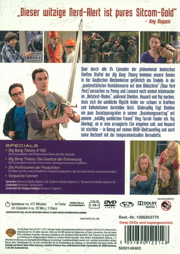 Noch immer kämpfen die zwei hochbegabten Physiker Leonard Hofstadter und Sheldon Cooper mit den Tücken des Lebens, denn zwar verstehen die zwei die Strukturfeinheiten von Atomen – die von Frauen allerdings nicht. In Staffel fünf bringt Penny mal wieder die Sinne aller männlichen Protagonisten durcheinander, denn sie wurde mit Raj im Bett erwischt. Seltsamerweise behauptet sie, dass dies nicht das sei, wonach es aussehe. Sheldon verliert den Überblick genauso wie Raj, dem solche nächtlichen Begegnungen nicht oft passieren. Mit witzigen Dialogen, liebevollen Charakterzeichnungen und einem perfekten Darstellergespann überzeugt „The Big Bang Theory“ auch in der fünften Staffel in jeder Episode!