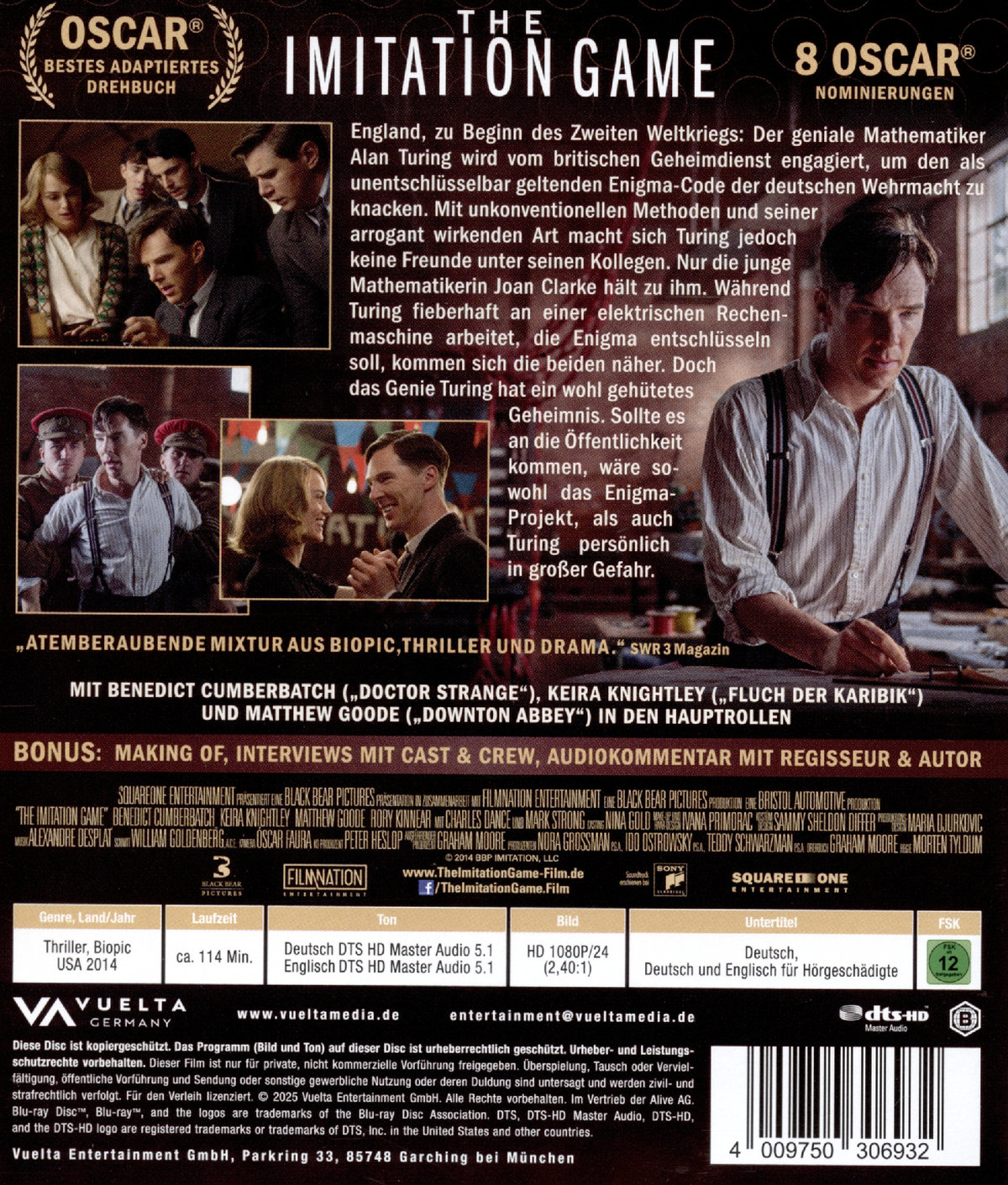 England, zu Beginn des Zweiten Weltkriegs: Der geniale Mathematiker Alan Turing (BENEDICT CUMBERBATCH) wird vom britischen Geheimdienst engagiert, um - gemeinsam mit einer Gruppe von Code-Spezialisten - den als unentschlüsselbar geltenden Enigma-Code der deutschen Wehrmacht zu knacken. Mit unkonventionellen Methoden und seiner arrogant wirkenden Art macht sich Turing jedoch keine Freunde unter seinen Kollegen. Nur die junge Mathematikerin Joan Clarke (KEIRA KNIGHTLEY) hält zu ihm - sie sieht in ihm eine verwandte Seele, einen Außenseiter, der sich gegen alle Widerstände durchsetzen muss. Während Turing fieberhaft an einer elektrischen Rechenmaschine arbeitet, die Enigma entschlüsseln soll, kommen sich die beiden näher. Doch das Genie Turing hat ein wohl gehütetes Geheimnis. Sollte es an die Öffentlichkeit kommen, wäre sowohl das Enigma-Projekt, als auch Turing persönlich in großer Gefahr.