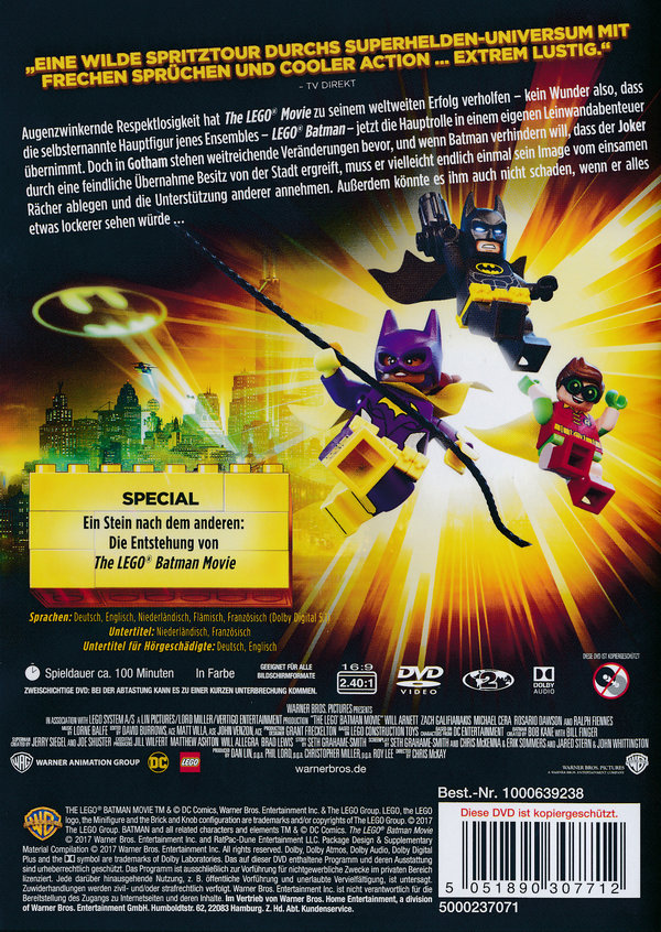 Augenzwinkernde Respektlosigkeit hat „The LEGO® Movie“ zu seinem weltweiten Erfolg verholfen – kein Wunder also, dass die selbsternannte Hauptfigur jenes Ensembles – LEGO Batman – jetzt die Hauptrolle in einem eigenen Leinwandabenteuer übernimmt. Doch in Gotham stehen weitreichende Veränderungen bevor, und wenn Batman verhindern will, dass der Joker sich die Stadt durch eine feindliche Übernahme einverleibt, muss er vielleicht endlich einmal sein Image vom einsamen Rächer revidieren und die Unterstützung anderer annehmen. Außerdem könnte es ihm auch nicht schaden, wenn er alles etwas lockerer sehen würde …