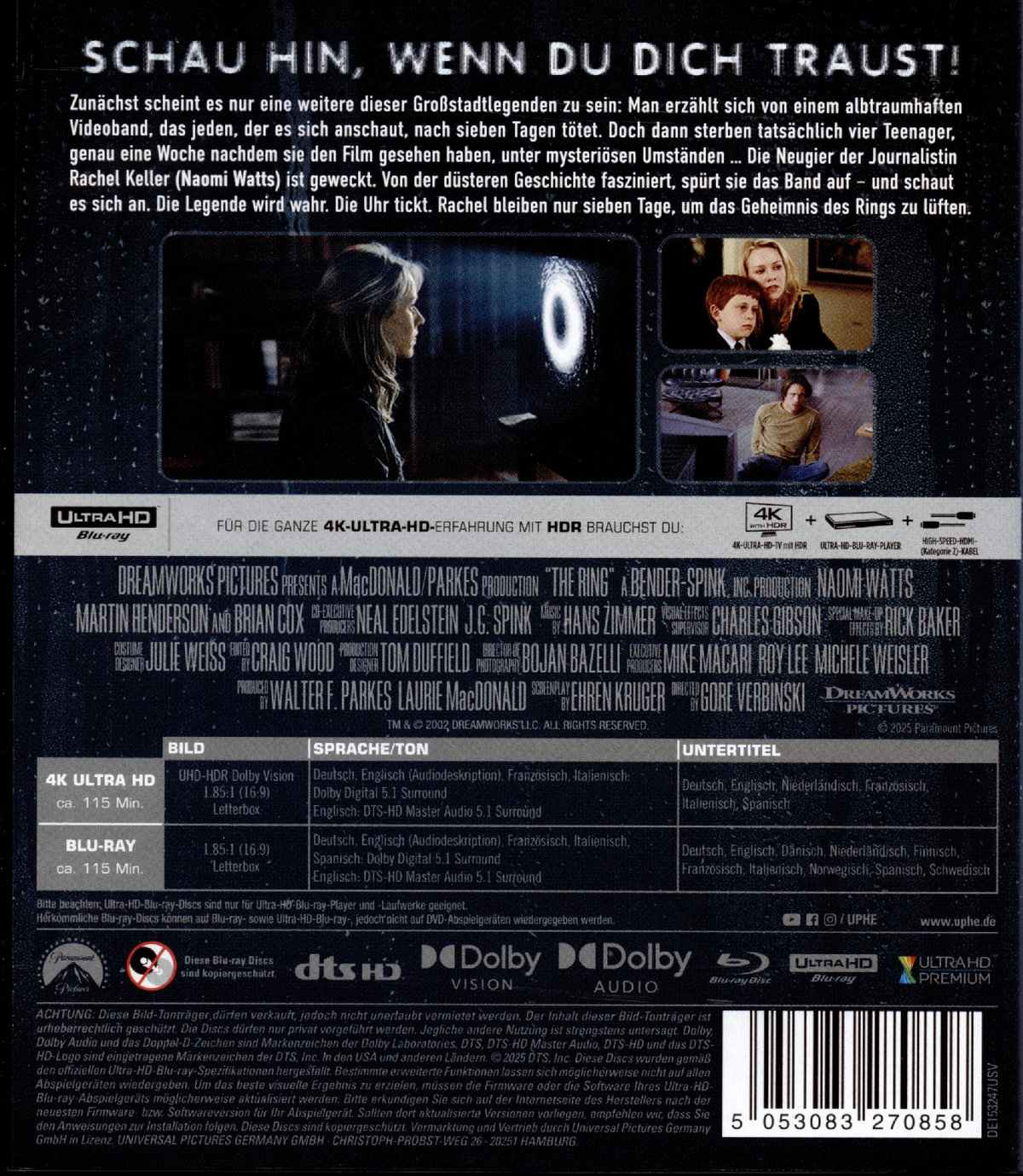 Schau hin, wenn du dich traust!Zunächst scheint es nur eine weitere dieser Großstadtlegenden zu sein: Man erzählt sich von einem albtraumhaften Videoband, das jeden, der es sieht, nach sieben Tagen tötet. Doch dann sterben tatsächlich vier Teenager, genau eine Woche nachdem sie das Band gesehen haben, unter mysteriösen Umständen ...Die Neugier der Journalistin Rachel Keller (Naomi Watts) ist geweckt. Von der düsteren Geschichte fasziniert, spürt sie das Band auf - und schaut es sich an. Die Legende wird wahr. Die Uhr tickt. Rachel bleiben nur sieben Tage, um das Geheimnis des Rings zu lüften.