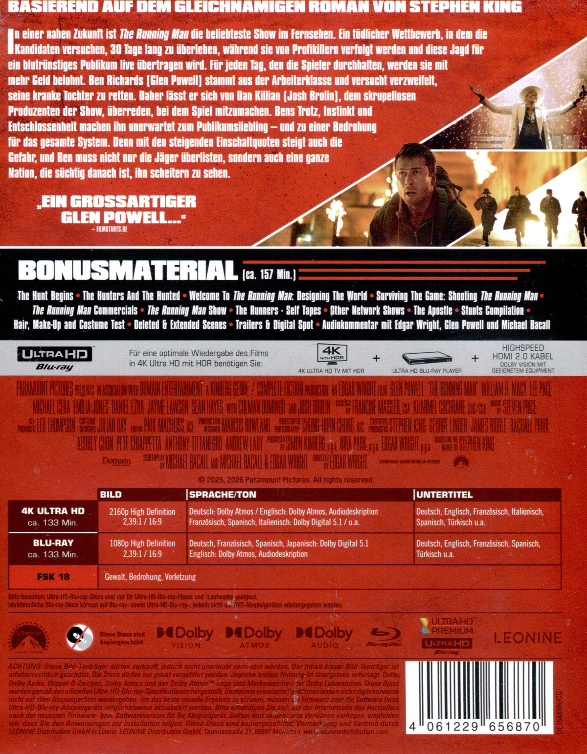In einer nahen Zukunft ist The Running Man die meistgesehene Show im Fernsehen. Ein tödlicher Wettbewerb, in dem die Mitspieler, die man Runner nennt, 30 Tage lang überleben müssen, während sie von Profikillern gejagt werden. Dabei wird jede ihrer Bewegungen einem blutrünstigen Publikum live übertragen. Jeder Tag, den sie durchhalten, wird mit mehr Geld belohnt. Ben Richards (Glen Powell) stammt aus der Arbeiterklasse und versucht verzweifelt, seine kranke Tochter zu retten. Daher lässt er sich von Dan Killian (Josh Brolin), dem charmanten, aber rücksichtslosen Produzenten der Show, als letzte Hoffnung überreden, bei dem Spiel mitzumachen. Bens Trotz, Instinkte und Mut machen ihn bald unerwartet zum Fan-Favoriten - und zu einer Bedrohung für das gesamte System. Während die Einschaltquoten durch die Decke gehen, steigt auch die Gefahr und Ben muss nicht nur die Jäger überlisten, sondern auch eine ganze Nation, die süchtig danach ist, ihn scheitern zu sehen. Basierend auf dem Roman von Stephen King