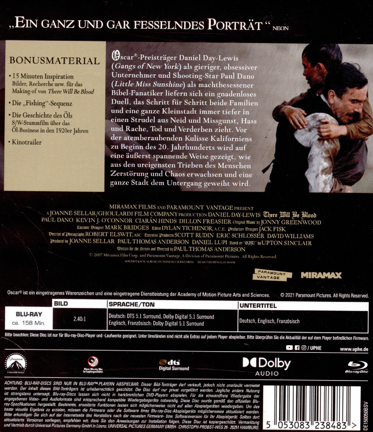 Oscar®-Preisträger Daniel Day-Lewis (Gangs of New York) als gieriger, obsessiver Unternehmer und Shooting-Star Paul Dano (Little Miss Sunshine) als machtbesessener Bibel-Fanatiker liefern sich ein gnadenloses Duell, das Schritt für Schritt beide Familien und eine ganze Kleinstadt immer tiefer in einen Strudel aus Neid und Missgunst, Hass und Rache, Tod und Verderben zieht.Vor der atemberaubenden Kulisse Kaliforniens zu Beginn des 20. Jahrhunderts wird auf eine äußerst spannende Weise gezeigt, wie aus den ureigensten Trieben des Menschen Zerstörung und Chaos erwachsen und eine ganze Stadt dem Untergang geweiht wird.