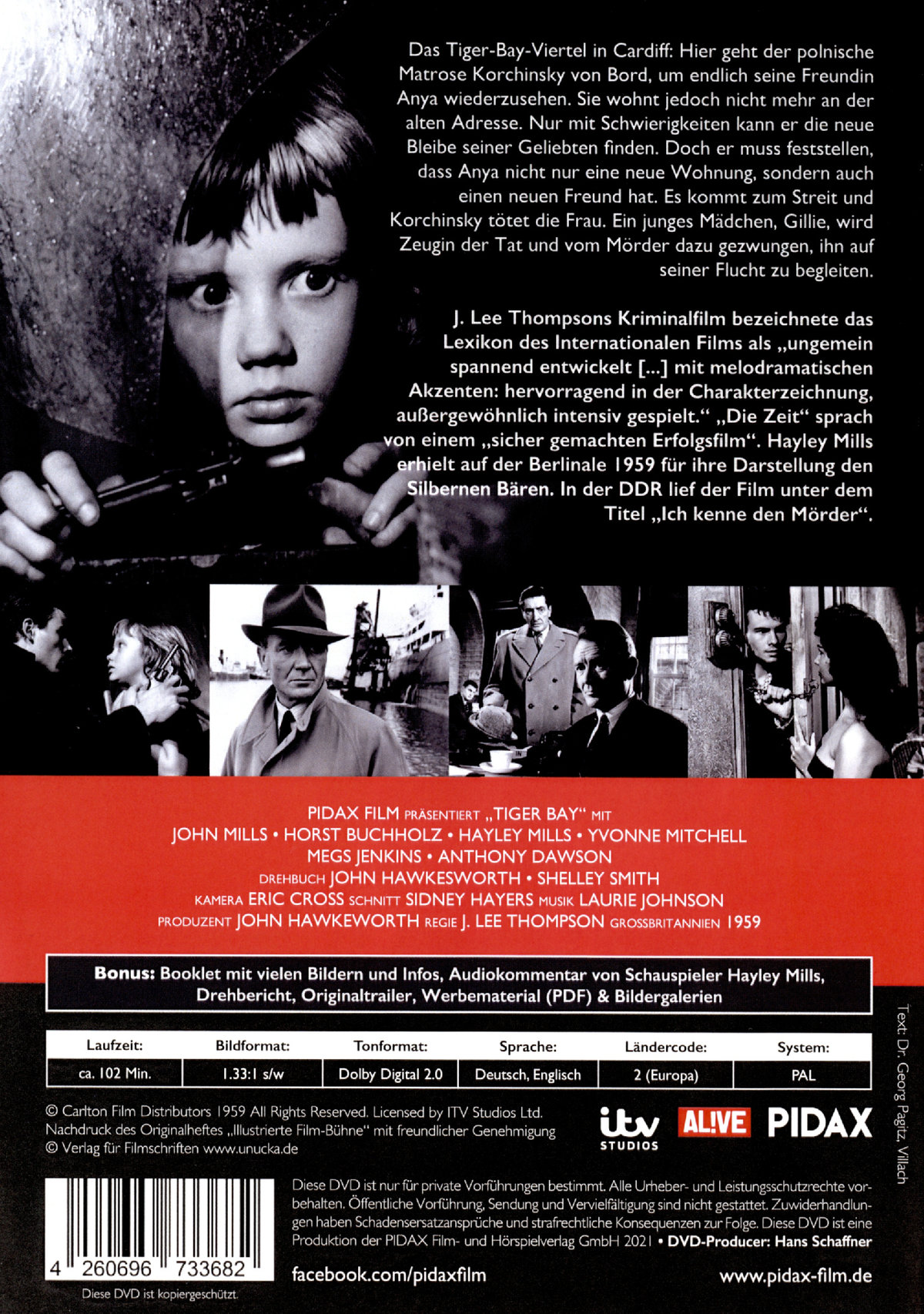 Das Tiger-Bay-Viertel in Cardiff: Hier geht der polnische Matrose Korchinsky von Bord, um endlich seine Freundin Anya wiederzusehen. Sie wohnt jedoch nicht mehr an der alten Adresse. Nur mit Schwierigkeiten kann er die neue Bleibe seiner Geliebten finden. Doch er muss feststellen, dass Anya nicht nur eine neue Wohnung, sondern auch einen neuen Freund hat. Es kommt zum Streit und Korchinsky tötet die Frau. Ein junges Mädchen, Gillie, wird Zeugin der Tat und vom Mörder dazu gezwungen, ihn auf seiner Flucht zu begleiten. J. Lee Thompsons Kriminalfilm bezeichnete das Lexikon des Internationalen Films als "ungemein spannend entwickelt [...] mit melodramatischen Akzenten: hervorragend in der Charakterzeichnung, außergewöhnlich intensiv gespielt." "Die Zeit" sprach von einem "sicher gemachten Erfolgsfilm". Hayley Mills erhielt auf der Berlinale 1959 für ihre Darstellung den Silbernen Bären. In der DDR lief der Film unter dem Titel "Ich kenne den Mörder".
