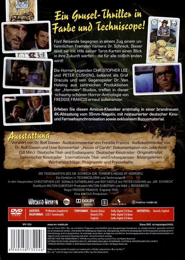 Die Horror-Legenden CHRISTOPHER LEE und PETER CUSHING, bekannt als Graf Dracula und sein Gegenspieler Dr. Van Helsing aus zahlreichen Produktionen der „Hammer“-Studios, treffen in dieser schaurig-schönen Horror-Anthologie von FREDDIE FRANCIS erneut aufeinander. Erleben Sie diesen Amicus-Klassiker erstmalig in einer brandneuen 4K-Abtastung vom 35mm-Negativ, mit restaurierter deutscher Kino- und Fernsehsynchronisation sowie exklusivem Bonusmaterial.