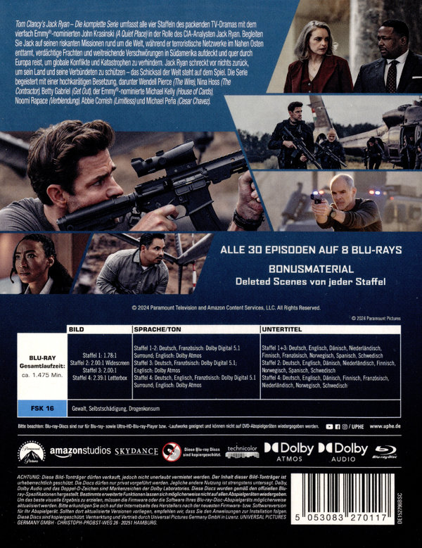 Tom Clancy's Jack Ryan - Die komplette Serie umfasst alle vier Staffeln des packenden TV-Dramas mit dem vierfach Emmy®-nominierten John Krasinski ("A Quiet Place") in der Rolle des CIA-Analysten Jack Ryan. Begleiten Sie Jack auf seinen riskanten Missionen rund um die Welt, während er terroristische Netzwerke im Nahen Osten enttarnt, verdächtige Frachten und weitreichende Verschwörungen in Südamerika aufdeckt und quer durch Europa reist, um globale Konflikte und Katastrophen zu verhindern. Jack Ryan schreckt vor nichts zurück, um sein Land und seine Verbündeten zu schützen - das Schicksal der Welt steht auf dem Spiel.Die Serie begeistert mit einer hochkarätigen Besetzung, darunter Wendell Pierce ("The Wire"), Nina Hoss ("The Contractor"), Betty Gabriel ("Get Out"), der Emmy®-nominierte Michael Kelly ("House of Cards"), Noomi Rapace ("Verblendung"), Abbie Cornish ("Limitless") und Michael Peña ("Cesar Chavez").