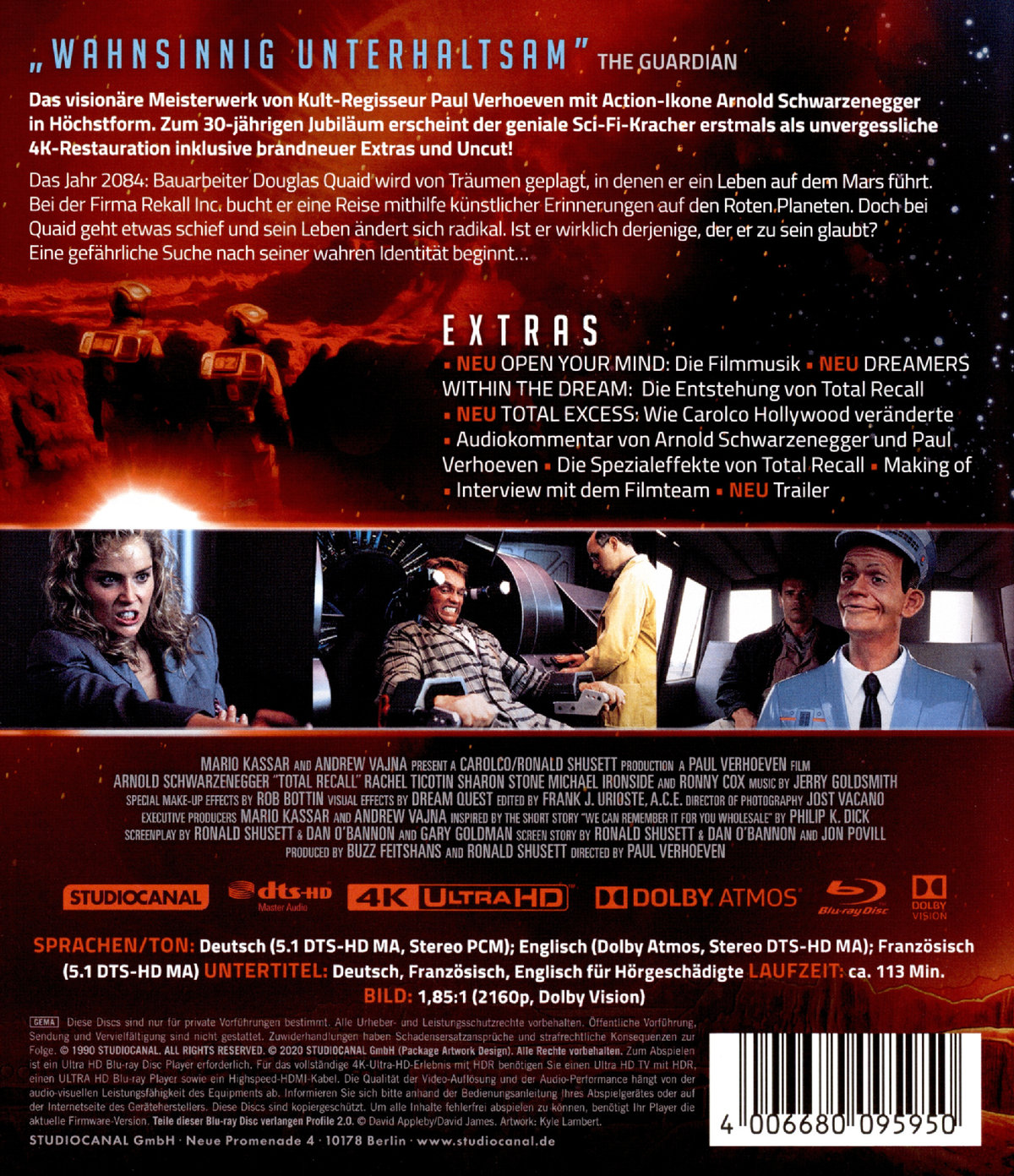 TOTAL EXCESS: Wie Carolco Hollywood veränderte, OPEN YOUR MIND: Die Filmmusik, DREAMERS WITHIN THE DREAM: Die Entstehung von Total Recall, Audiokommentar von Arnold Schwarzenegger und Paul Verhoeven, Die Spezialeffekte von TOTAL RECALL, Making of, Interview mit dem Filmteam, Trailer; Wendecover