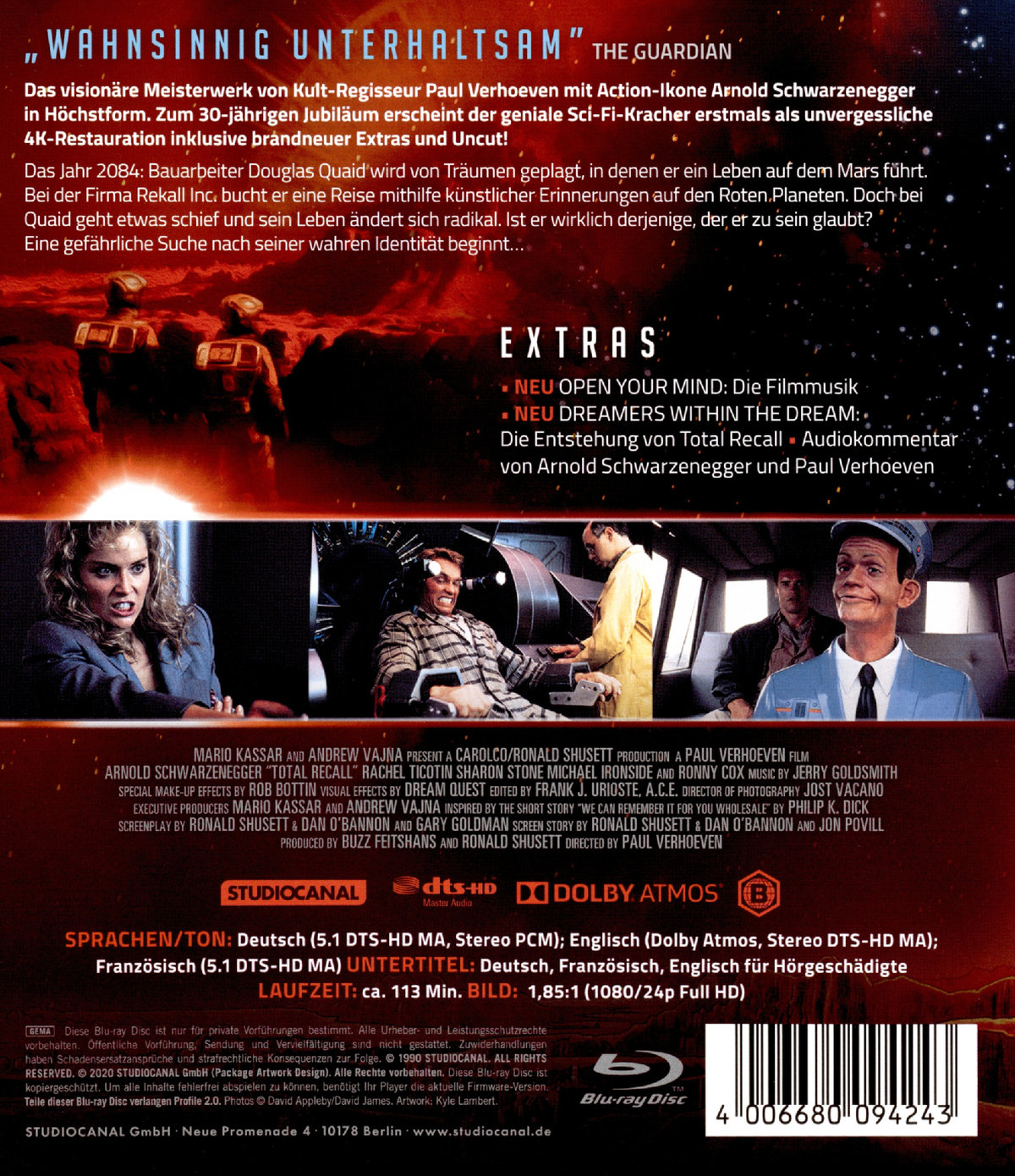 Das Jahr 2084: Bauarbeiter Douglas Quaid wird von Träumen geplagt, in denen er ein Leben auf dem Mars führt. Bei der Firma Rekall Inc. bucht er eine virtuelle Reise auf den Roten Planeten. Doch bei Quaid geht etwas schief und sein Leben ändert sich radikal. Ist er wirklich derjenige, der er zu sein glaubt? Eine gefährliche Suche nach seiner wahren Identität beginnt… Verhoevens kultiges Sci-Fi-Meisterwerk mit Arnie in Höchstform erstmals restauriert in 4K!