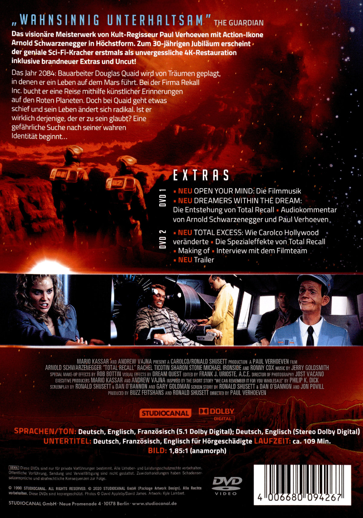 OPEN YOUR MIND: Die Filmmusik, DREAMERS WITHIN THE DREAM: Die Entstehung von Total Recall, Audiokommentar von Arnold Schwarzenegger und Paul Verhoeven