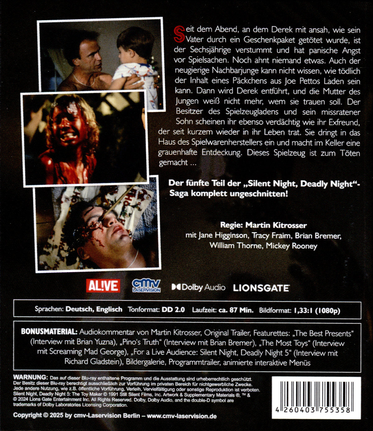 Audiokommentar von Martin Kitrosser ; Original Trailer ; Featurettes: "The Best Presents" (Interview mit Brian Yuzna); "Pino's Truth" (Interview mit Brian Bremer); "The Most Toys" (Interview mit Screaming Mad George); "For a Live Audience: Silent Night; Deadly Night 5" (Interview mit Richard Gladstein) ; Bildergalerie; Programmtrailer; animierte interaktive Menüs