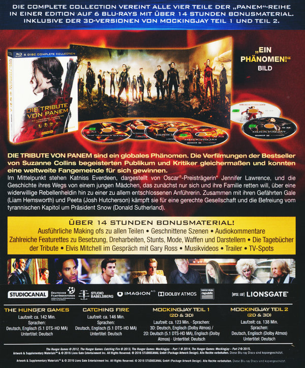 Die Trilogie „Die Tribute von Panem" zählt zu den größten Buchhits der letzten Jahre. Mit der Verfilmung erreichte die Trilogie neue Rekorde. Neben den derzeit heißesten PANEM-Filmstars Josh Hutcherson, Liam Hemsworth und der Oscar®- und Golden-Globe-Preisträgerin Jennifer Lawrence sind auch die charismatischen Hollywood-Größen Woody Harrelson („True Detective“), Stanley Tucci („Der Teufel trägt Prada“), Donald Sutherland („Wenn die Gondeln Trauer tragen“), Philip Seymour Hoffman („Capote“) und die vierfach Oscar®-nominierte Julianne Moore („Still Alice“) mit dabei. In der Complete Edition sind alle Teile der erfolgreichen Reihe auf 6 Blu-rays, davon Mockingjay Teil 1 und Teil 2 als 3D-Fassung, und mit bis zu 15 Stunden Bonusmaterial enthalten.