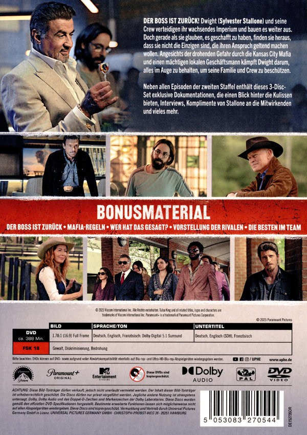 Der Boss ist zurück!Dwight (Sylvester Stallone) und seine Crew verteidigen ihr wachsendes Imperium und bauen es weiter aus. Doch gerade als sie glauben, es geschafft zu haben, finden sie heraus, dass sie nicht die Einzigen sind, die ihren Anspruch geltend machen wollen. Angesichts der drohenden Gefahr durch die Kansas City Mafia und einen mächtigen lokalen Geschäftsmann kämpft Dwight darum, alles im Blick zu behalten, um seine Familie und Crew zu beschützen. Neben allen Episoden der zweiten Staffel enthält dieses 3-Disc-Set exklusive Dokumentationen, die einen Blick hinter die Kulissen bieten, Interviews, Komplimente von Stallone an die Mitwirkenden und vieles mehr Alle 10 Episoden der 2. Staffel auf 3 DiscsEpisodenübersicht- Wieder im Sattel- Kansas City Blues- Oklahoma gegen Manfredi- Helden und Schurken- Der Kampf gegen Windmühlen- Navigator- Lebenserhaltung- Unter neuer Leitung- Triade- Der Neuaufbau