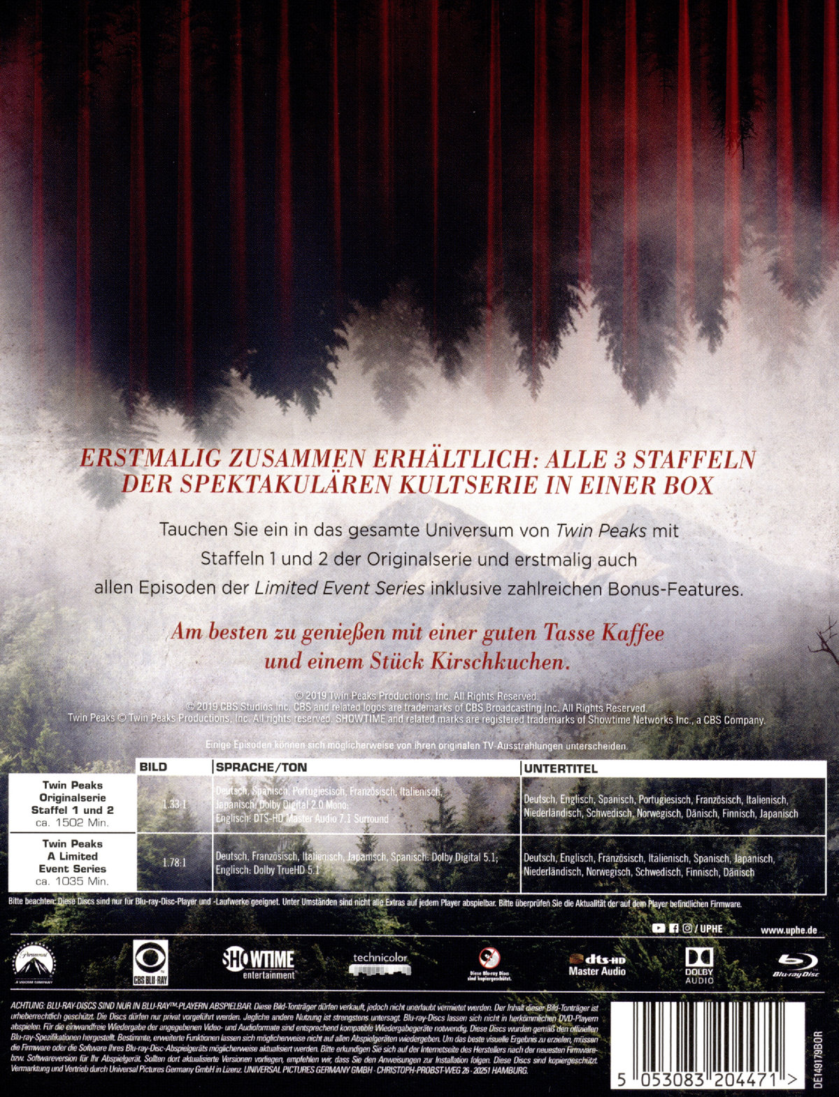 Am besten zu genießen mit einer guten Tasse Kaffee und einem Stück Kirschkuchen.Die bahnbrechende TV-Serie "Twin Peaks", erschaffen von David Lynch und Mark Frost, wurde erstmals komplett neu überarbeitet und gewährt nie zuvor gesehene Einblicke in die Tiefen der Wälder.Twin Peaks - Season 1Nach dem brutalen Mord an Twin Peaks' Schönheitskönigin Laura Palmer entdeckt Agent Cooper (Kyle MacLachlan), dass diese kleine Stadt übersät ist mit tödlichen Geheimnissen und möderischen Süssigkeiten. Cooper interpretiert einen Traum über den Mörder, trinkt Tee mit der Log Lady, findet den makabren Ort eines Verbrechens im Wald und ist erwählt, das Rätsel zu lösen.Twin Peaks - Season 2Die Jagd nach dem Mörder von Twin Peaks' Ballkönigin Laura Palmer geht weiter, aber Special Agent Dale Cooper (Kyle MacLachlan) wird nach dem nicht autorisierten Zugriff auf das One-Eyed Jacks Casino vom Dienst suspendiert und gerät selbst ins Kreuzfeuer. Trotz dieser kleinen Unannehmlichkeiten entdeckt Cooper einige Hinweise über die Identität der Person, die auf ihn geschossen hat. Und mit der Hilfe von Sheriff Harry S. Truman (Michael Ontkean) versucht Cooper, das Geheimnis der Schwarzen Hütte zu lüften ... Mit seinen unheilvollen Enthüllungen könnte dieses Unterfangen einen ganz besonderen Teil zu den Vorbereitungen zum "Miss Twin Peaks"-Wettbewerb beisteuern.Twin Peaks - A limited Event SeriesRund ein Viertel Jahrhundert nachdem "Twin Peaks" die Serienwelt...