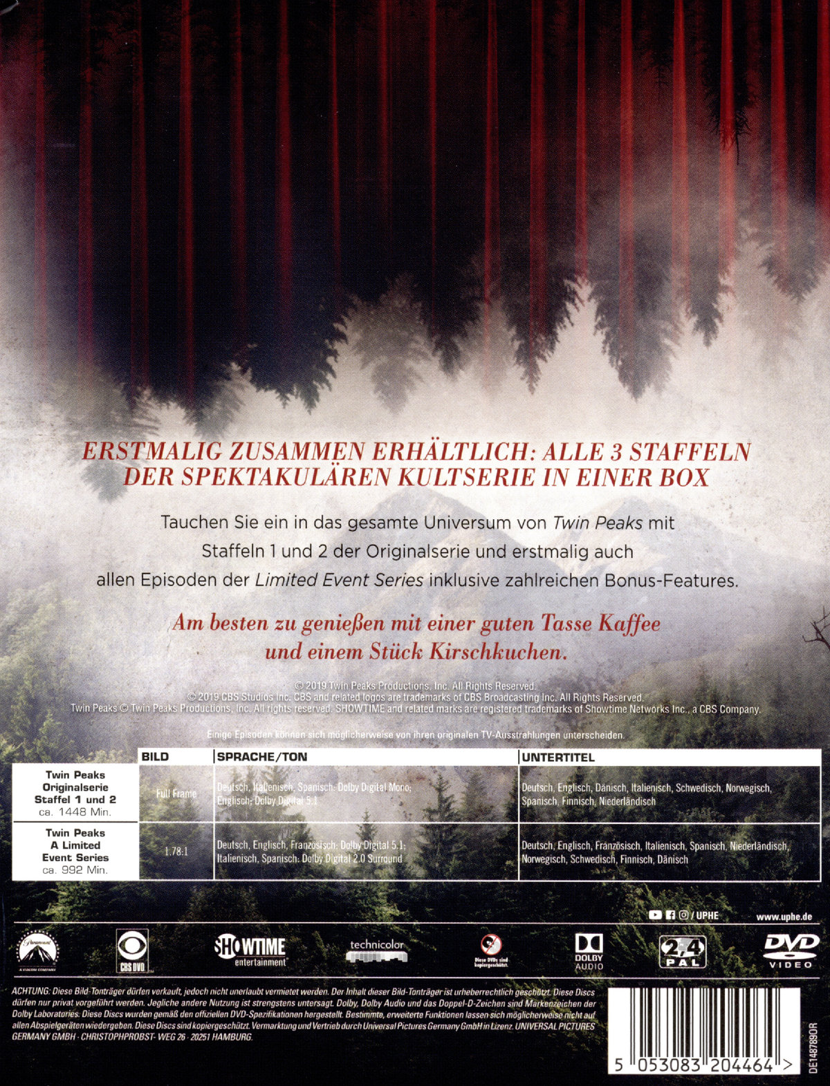 Am besten zu genießen mit einer guten Tasse Kaffee und einem Stück Kirschkuchen.Die bahnbrechende TV-Serie "Twin Peaks", erschaffen von David Lynch und Mark Frost, wurde erstmals komplett neu überarbeitet und gewährt nie zuvor gesehene Einblicke in die Tiefen der Wälder.Twin Peaks - Season 1Nach dem brutalen Mord an Twin Peaks' Schönheitskönigin Laura Palmer entdeckt Agent Cooper (Kyle MacLachlan), dass diese kleine Stadt übersät ist mit tödlichen Geheimnissen und möderischen Süssigkeiten. Cooper interpretiert einen Traum über den Mörder, trinkt Tee mit der Log Lady, findet den makabren Ort eines Verbrechens im Wald und ist erwählt, das Rätsel zu lösen.Twin Peaks - Season 2Die Jagd nach dem Mörder von Twin Peaks' Ballkönigin Laura Palmer geht weiter, aber Special Agent Dale Cooper (Kyle MacLachlan) wird nach dem nicht autorisierten Zugriff auf das One-Eyed Jacks Casino vom Dienst suspendiert und gerät selbst ins Kreuzfeuer. Trotz dieser kleinen Unannehmlichkeiten entdeckt Cooper einige Hinweise über die Identität der Person, die auf ihn geschossen hat. Und mit der Hilfe von Sheriff Harry S. Truman (Michael Ontkean) versucht Cooper, das Geheimnis der Schwarzen Hütte zu lüften ... Mit seinen unheilvollen Enthüllungen könnte dieses Unterfangen einen ganz besonderen Teil zu den Vorbereitungen zum "Miss Twin Peaks"-Wettbewerb beisteuern.Twin Peaks - A limited Event SeriesRund ein Viertel Jahrhundert nachdem "Twin Peaks" die Serienwelt...
