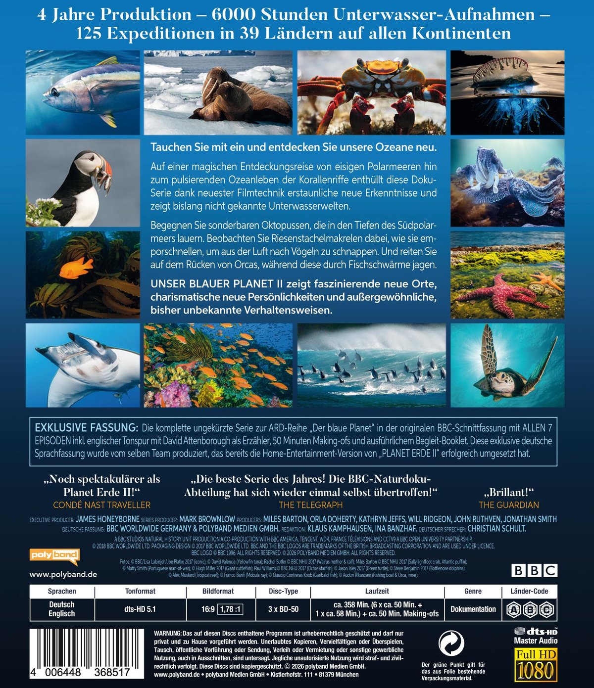 EXKLUSIVE HOME-ENTERTAINMENT-FASSUNG: Die originale BBC-Schnittfassung ALLER 7 EPISODEN inkl. englischer Tonspur mit David Attenborough als Erzähler, 50 Minuten Making-ofs und ausführlichem Begleit-Booklet. Diese exklusive deutsche Sprachfassung wurde vom selben Team produziert, das bereits die Home-Entertainment-Version von „PLANET ERDE II“ erfolgreich umgesetzt hat.