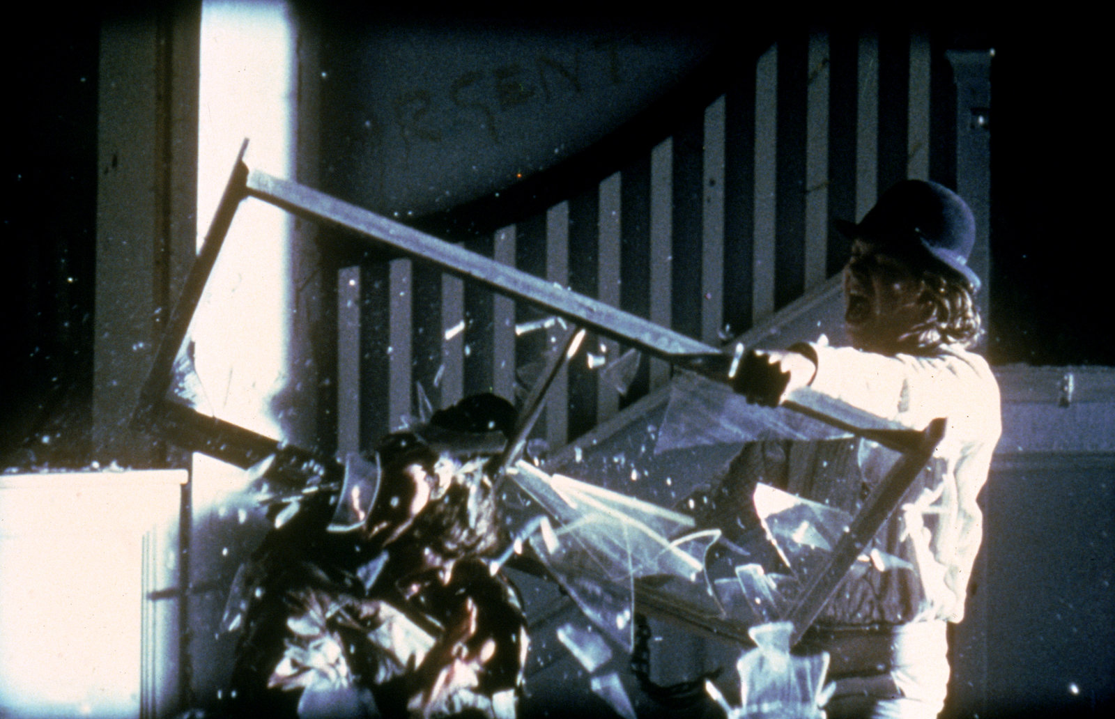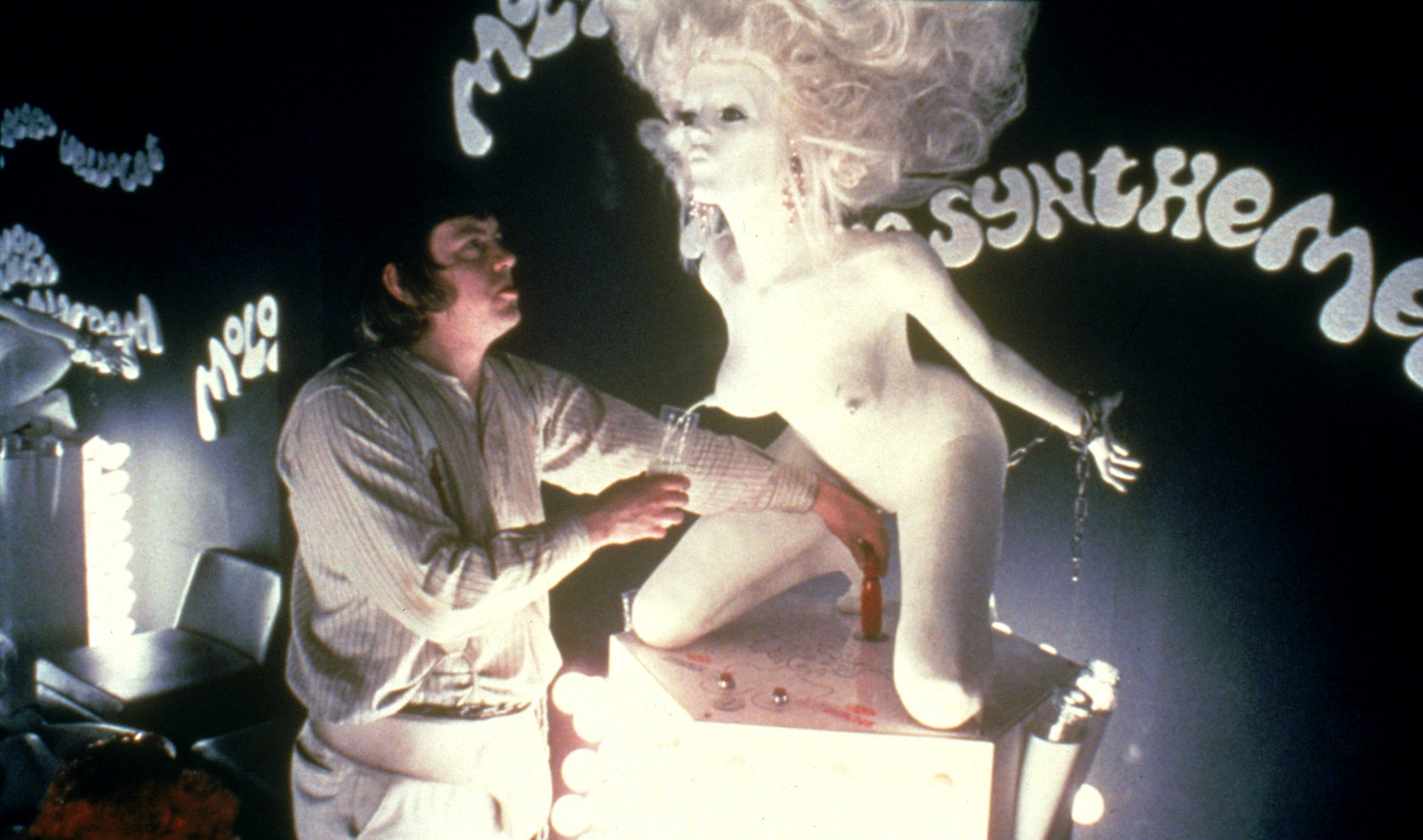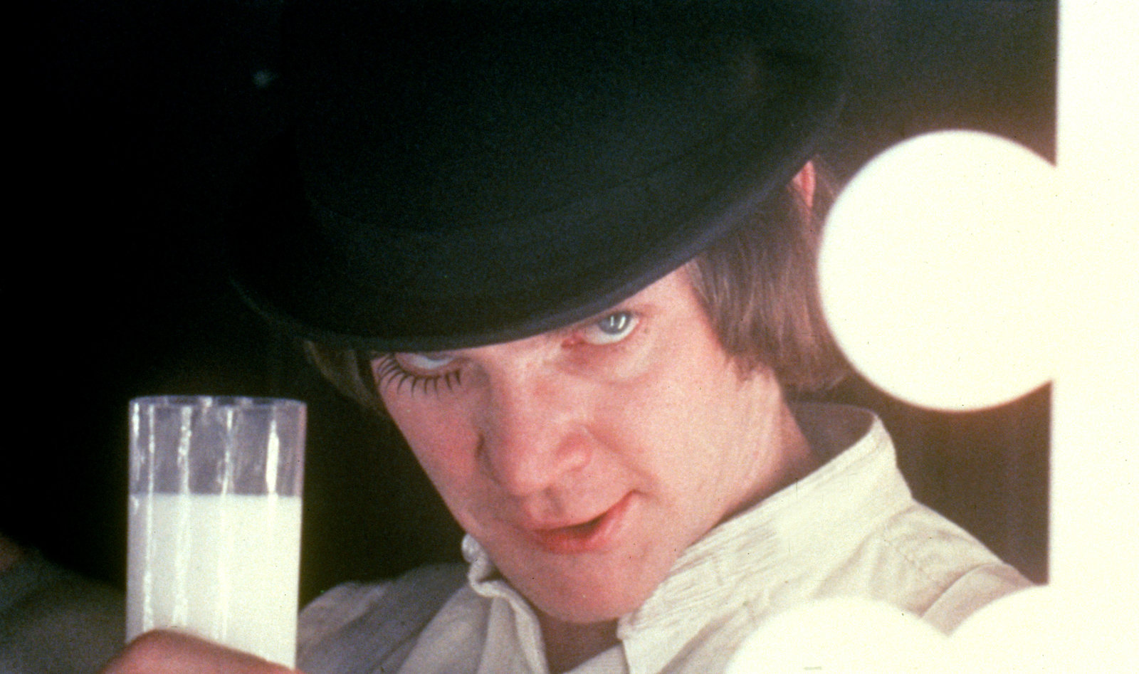 Das Gesicht starrt uns brutal an, bildschirmfüllend. Langsam fährt die Kamera zurück. Alex sitzt auf einer Couch der Korova Bar, umgeben von weißen Skulpturen nackter Frauen. Er nippt an seiner gedopten Milch, die "dich heiß macht, auf ein bisschen von der alten Ultra-Brutalität".