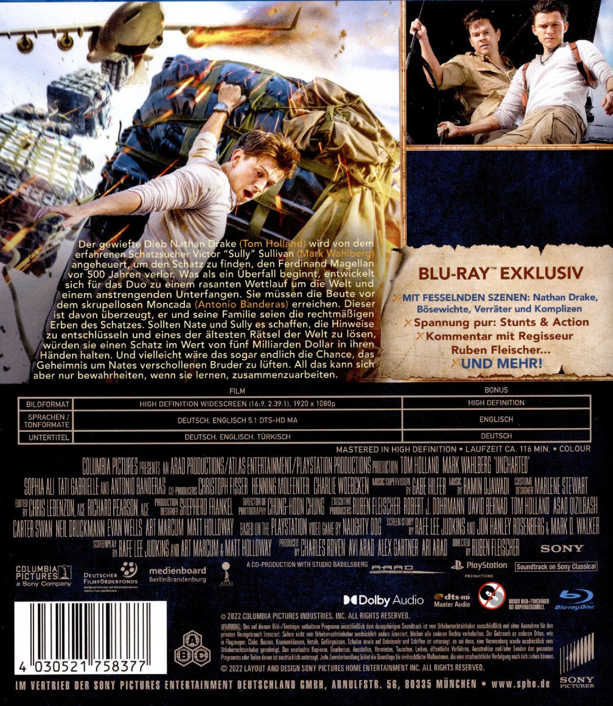 Der clevere Dieb Nathan Drake (Tom Holland) wird von dem erfahrenen Schatzsucher Victor „Sully“ Sullivan (Mark Wahlberg) angeworben, um ein Vermögen zu bergen, das Ferdinand Magellan vor 500 Jahren verloren hat. Was als große Heist-Aktion beginnt, entwickelt sich für das Duo zu einem rasanten Wettlauf um die Welt, um den Schatz vor dem skrupellosen Moncada (Antonio Banderas) zu erreichen, der glaubt, er und seine Familie seien die rechtmäßigen Erben. Wenn Nate und Sully alle Hinweise entschlüsseln und eines der ältesten Rätsel der Welt lösen können, haben sie die Chance, eine Beute im Wert von fünf Milliarden Dollar und vielleicht sogar Nates lange verschollenen Bruder zu finden... Aber nur, wenn sie lernen, zusammenzuarbeiten.