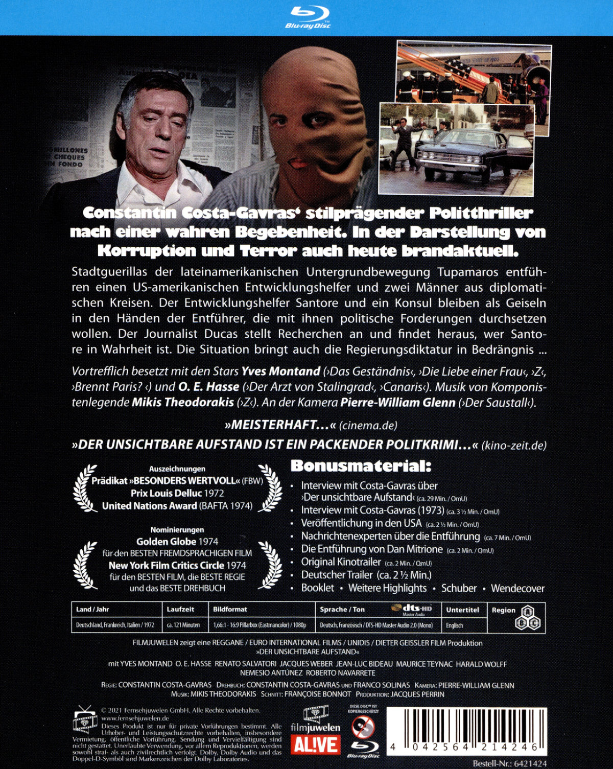 Booklet; Schuber; Wendecover; Interview mit Costa-Gavras 1973 (ca. 3 Min.); Filmveröffentlichung in den USA 1973 (ca. 2 Min.); "Die Ermordung von Dan Mitrione" 1970 (ca. 2 Min.); Originaltrailer; deutscher Trailer; weitere Highlights