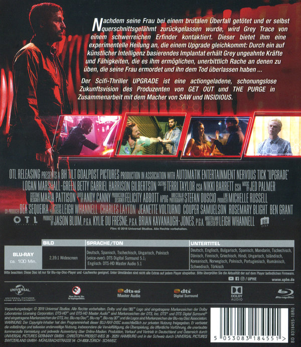 Weder Mensch noch MaschineNachdem seine Frau bei einem brutalen Überfall getötet und er selbst querschnittsgelähmt zurückgelassen wurde, wird Grey Trace von einem schwerreichen Erfinder kontaktiert. Dieser bietet ihm eine experimentelle Heilung an, die einem Upgrade gleichkommt: Durch ein auf künstlicher Intelligenz basierendes Implantat erhält Grey ungeahnte Kräfte und Fähigkeiten, die es ihm ermöglichen, unerbittlich Rache an denen zu üben, die seine Frau ermordet und ihn dem Tod überlassen haben...Der Scifi-Thriller "Upgrade" ist eine actiongeladene, schonungslose Zukunftsvision des Produzenten von "Get Out" und "The Purge" in Zusammenarbeit mit dem Macher von "Saw" und "Insidious".