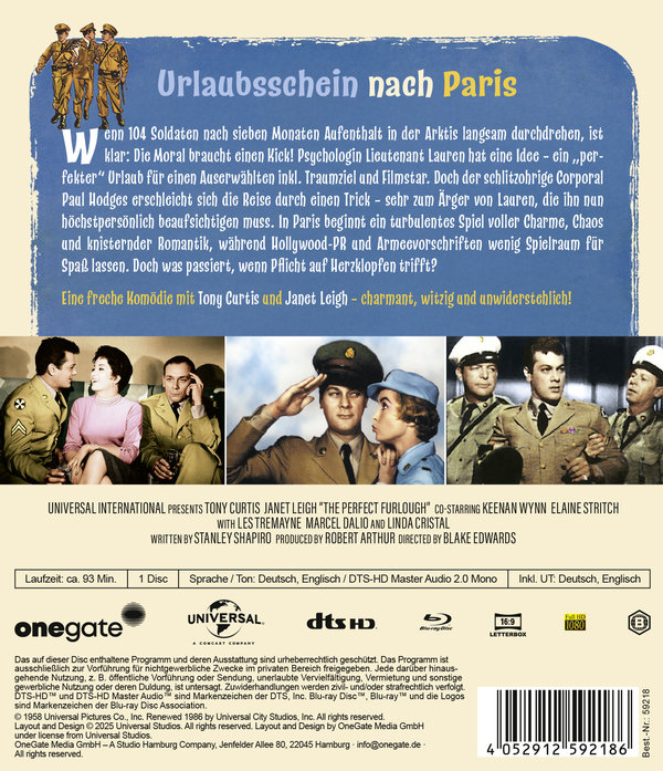 Wenn 104 Soldaten nach sieben Monaten Aufenthalt in der Arktis langsam durchdrehen, ist klar: Die Moral braucht einen Kick! Psychologin Lieutenant Lauren hat eine Idee: ein „perfekter“ Urlaub für einen Auserwählten inkl. Traumziel und Filmstar. Doch der schlitzohrige Corporal Paul Hodges schnappt sich die Reise durch einen Trick – sehr zum Ärger von Lauren, die ihn nun höchstpersönlich beaufsichtigen muss. In Paris beginnt ein turbulentes Spiel voller Charme, Chaos und knisternder Romantik, während Hollywood-PR und Armeevorschriften alles andere als Spaß verstehen. Doch was passiert, wenn Pflicht auf Herzklopfen trifft? Eine freche Komödie mit Tony Curtis und Janet Leigh – charmant, witzig und unwiderstehlich!