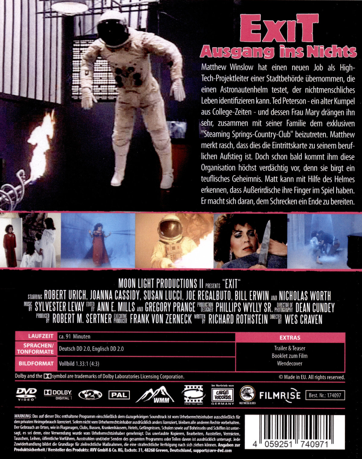 Matthew Winslow hat einen neuen Job als High-Tech-Projektleiter einer Stadtbehörde übernommen, die einen Astronautenhelm testet, der nichtmenschliches Leben identifizieren kann. Ted Peterson - ein alter Kumpel aus College-Zeiten - und dessen Frau Mary drängen ihn sehr, zusammen mit seiner Familie dem exklusiven "Steaming Springs-Country-Club" beizutreten. Matthew merkt rasch, dass dies die Eintrittskarte zu seinem beruflichen Aufstieg ist. Doch schon bald kommt ihm diese Organisation höchst verdächtig vor, denn sie birgt ein teuflisches Geheimnis. Matt kann mit Hilfe des Helmes erkennen, dass Außerirdische ihre Finger im Spiel haben. Er macht sich daran, dem Schrecken ein Ende zu bereiten. Bild: 1.33:1 Vollbild Ton: Deutsch / Englisch DD 2.0 Extras: Trailer, TV-Spot, Booklet - Einer der wenigen bisher unveröffentlichten Filme von Wes Craven endlich auf DVD. - mit BARRET OLIVER aus "Die unendliche Geschichte" - Brandneues Master, inklusive US-TV-Spot und deutschem Trailer. - Im Handel als dicke 14mm Scanavo-Style-Hülle mit Wendecover und Booklet. - From The Vault # 30