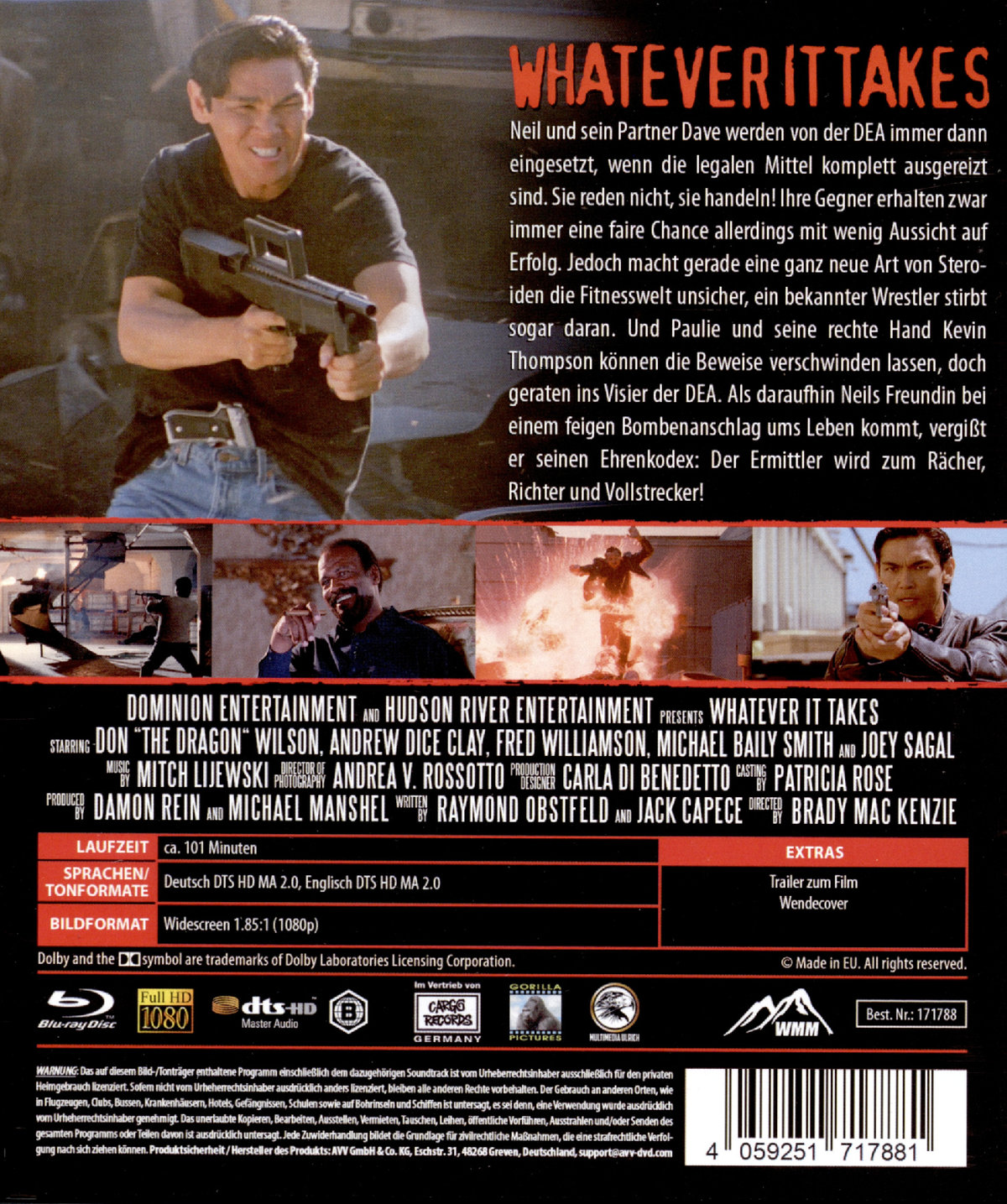 Whatever it Takes - 4K HD Remastered Neil und sein Partner Dave werden von der Polizei immer dann eingesetzt, wenn die legalen Mittel ausgereizt sind. Sie reden nicht, sie handeln! Ihre Gegner erhalten zwar immer eine faire Chance allerdings mit wenig Aussicht auf Erfolg. Als Neils Freundin bei einem feigen Bombenanschlag ums Leben kommt, vergißt er seinen Ehrenkodex: Der Ermittler wird zum Rächer, Richter und Vollstrecker! Bild: 1.85:1 (1080p) Ton: Deutsch / Englisch DTS HD MA 2.0 Extras: Interview mit Don "The Dragon" Wilson, Trailer zum Film