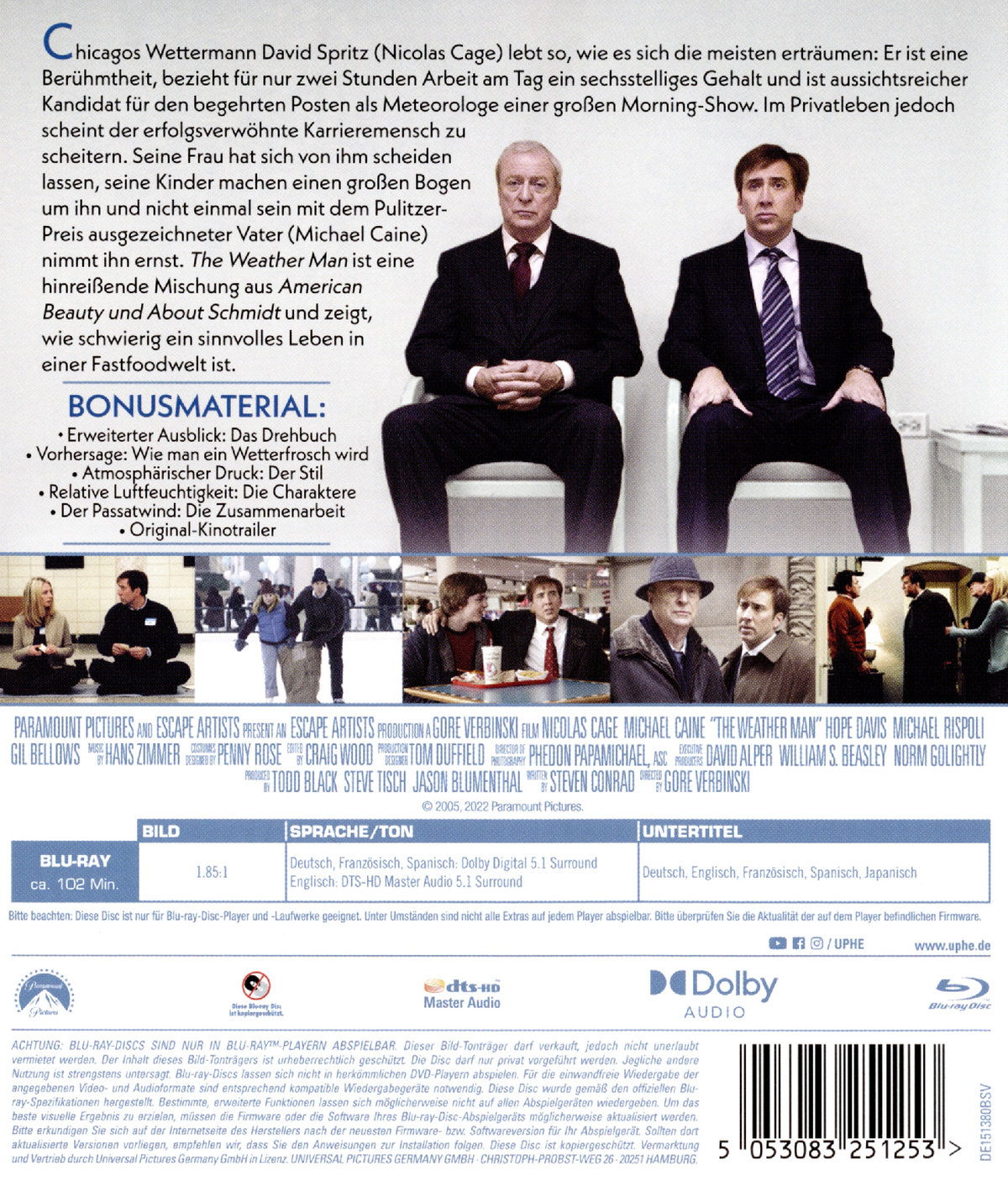 Chicagos Wettermann David Spritz (Nicolas Cage) lebt so, wie es sich die meisten erträumen: Er ist eine Berühmtheit, bezieht für nur zwei Stunden Arbeit am Tag ein sechsstelliges Gehalt und ist aussichtsreicher Kandidat für den begehrten Posten als Meteorologe einer großen Morning-Show. Im Privatleben jedoch scheint der erfolgsverwöhnte Karrieremensch zu scheitern. Seine Frau hat sich von ihm scheiden lassen, seine Kinder machen einen großen Bogen um ihn und nicht einmal sein mit dem Pulitzer-Preis ausgezeichneter Vater (Michael Caine) nimmt ihn ernst."The Weather Man" ist eine hinreißende Mischung aus "American Beauty" und "About Schmidt" und zeigt, wie schwierig ein sinnvolles Leben in einer Fastfoodwelt ist.