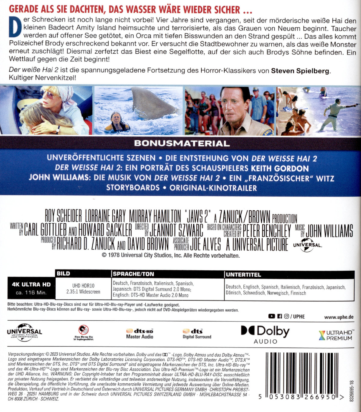 Gerade als sie dachten, das Wasser wäre wieder sicher ...Der Schrecken ist noch lange nicht vorbei! Vier Jahre sind vergangen, seit der mörderische weiße Hai den kleinen Badeort Amity Island heimsuchte und terrorisierte, als das Grauen von Neuem beginnt. Taucher werden auf offener See getötet, ein Orca mit tiefen Bisswunden an den Strand gespült ... Das alles kommt Polizeichef Brody erschreckend bekannt vor. Er versucht die Stadtbewohner zu warnen, als das weiße Monster erneut zuschlägt! Diesmal zerfetzt das Biest eine Segelflotte, auf der sich auch Brodys Söhne befinden. Ein Wettlauf gegen die Zeit beginnt!"Der weiße Hai 2" ist die spannungsgeladene Fortsetzung des Horror-Klassikers von Steven Spielberg. Kultiger Nervenkitzel!
