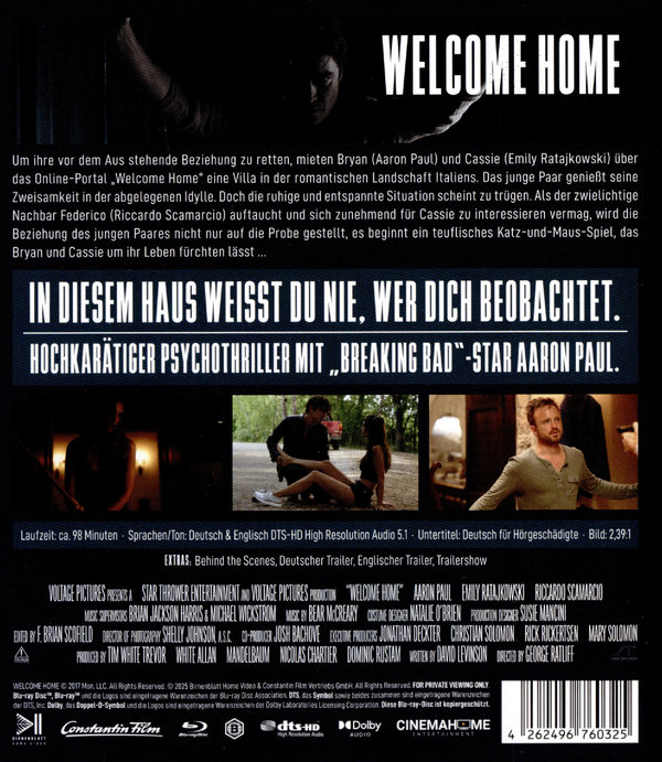 Um ihre vor dem Aus stehende Beziehung zu retten, mieten Bryan (Aaron Paul) und Cassie (Emily Ratajkowski) über das Online Portal "Welcome Home" eine Villa in der romantischen Landschaft Italiens. Das junge Paar genießt seine Zweisamkeit in der abgelegenen Idylle, doch die scheinbar ruhige und entspannte Situation scheint zu trügen.