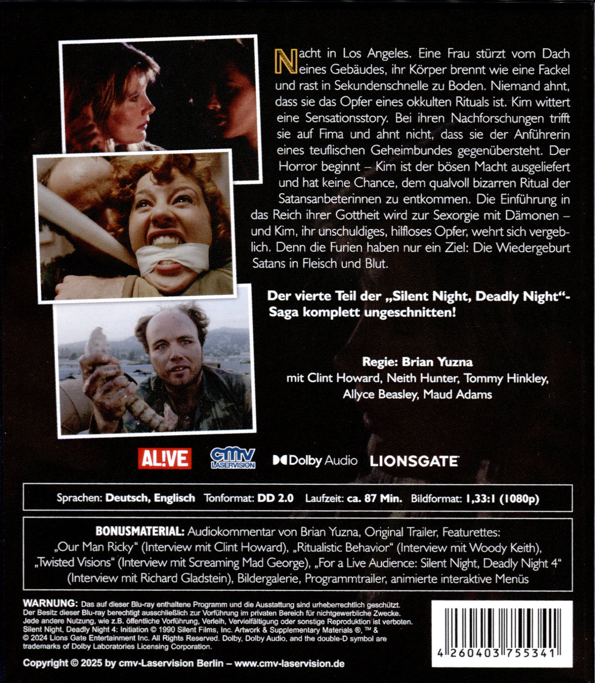 Audiokommentar von Brian Yuzna ; Original Trailer ; Featurettes: "Our Man Ricky" (Interview mit Clint Howard); "Ritualistic Behavior" (Interview mit Woody Keith); "Twisted Visions" (Interview mit Screaming Mad George); "For a Live Audience: Silent Night; Deadly Night 4" (Interview mit Richard Gladstein) ; Bildergalerie; Programmtrailer; animierte interaktive Menüs