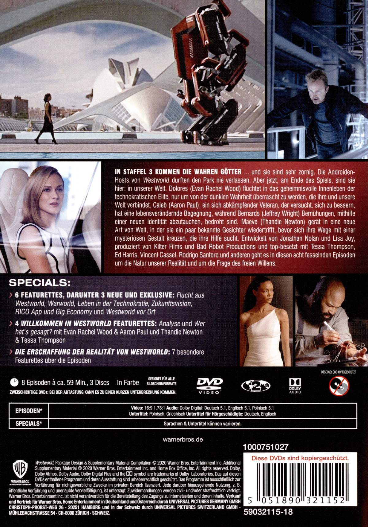 Flucht ist nicht Freiheit. Chaos ist nicht Revolution. Unabhängigkeit ist nicht verhandelbar. Und freier Wille ist nicht frei.Willkommen zurück zu "Westworld", der Emmy®-prämierten Dramaserie, die dem Beginn künstlichen Bewusstseins und der Evolution der Sünde folgt.In Staffel 3 kommen die wahren Götter... und sie sind sehr wütend. Geboren in eine Welt der Schmerzen, haben die Android-Hosts einen Ort nie gesehen: Unsere Welt. Doch nun, am Ende des Spiels, sind sie hier. Mit der Hilfe von Aaron Pauls menschlichem Caleb ist Dolores bereit, eine Revolution zu starten. Wenn das nicht funktioniert, kann sie es auf die altmodische Weise versuchen... und alle töten.Aaron Paul, Vincent Cassell, Lena Waithe und Scott Mescudi stoßen in der neuen Staffel, die sich mit Realität, freiem Willen und Menschlichkeit beschäftigt, zu Evan Rachel Woods Dolores, Jeffrey Wrights Bernard, Thandie Newtons Maeve und Ed Harris‘ William.Alle 8 Episoden der 3. StaffelEpisodenübersicht- Parce Domine- Mutter der Exilanten- Krisentheorie- Genre- Freibauer- Die Winterlinie- Dekohärenz- Anwesend in Abwesenheit