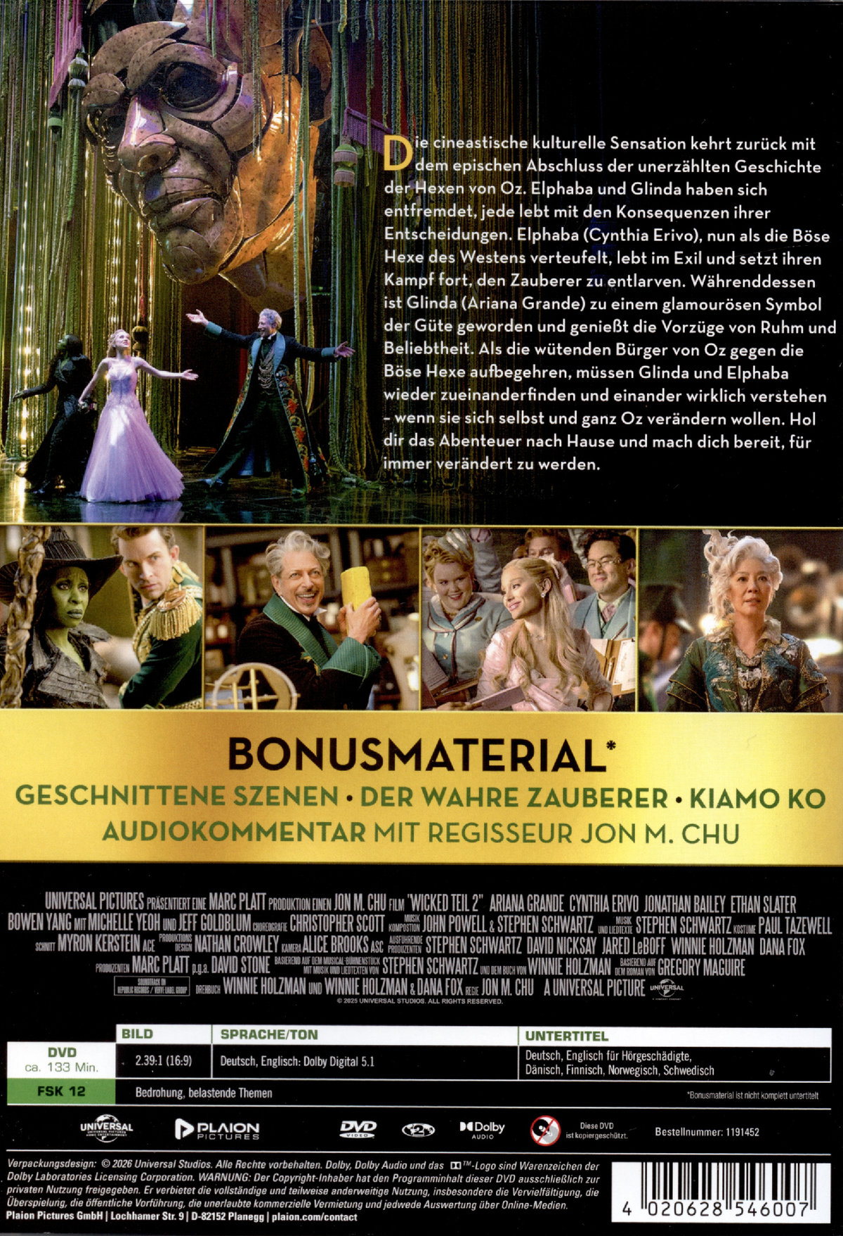 WICKED: TEIL 2 erzählt den Abschluss der unerzählten Geschichte der Hexen von Oz. Elphaba (Cynthia Erivo), als Böse Hexe des Westens verstoßen, kämpft im Exil für die Freiheit der Tiere und will die Wahrheit über den Zauberer (Jeff Goldblum) enthüllen. Glinda (Ariana Grande), nun Symbol des Guten, genießt den Ruhm im Palast, leidet aber unter der Trennung von Elphaba. Während ihre geplante Hochzeit mit Fiyero (Jonathan Bailey) naht, bedrohen Intrigen und ein Mädchen aus Kansas das fragile Gleichgewicht von Oz. Glinda und Elphaba müssen ein letztes Mal zusammenfinden, den ihre außergewöhnliche Freundschaft ist der Schlüssel zu ihrem Schicksal. WICKED: TEIL 2 vereint erneut die Oscar®-Nominierten Cynthia Erivo und Ariana Grande unter der Regie von Jon M. Chu (In the Heights). Mit Musik von Stephen Schwartz und einem preisgekrönten Kreativteam entfaltet das epische Finale des Erfolgs-Musicals seine Magie. Nach dem zehnfach oscarnominierten ersten Teil kehren die Hexen von Oz zurück – größer, emotionaler und spektakulärer als je zuvor.